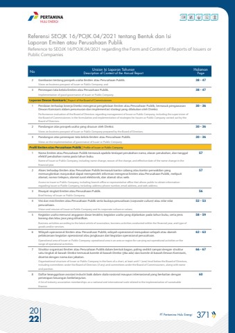 PT Pertamina Hulu Energi 371 2022Reference to SEOJK 16/POJK.04/2021 regarding the Form and Content of Reports of Issuers or Public CompaniesReferensi SEOJK 16/POJK.04/2021 tentang Bentuk dan Isi Laporan Emiten atau Perusahaan PublikNo Uraian Isi Laporan TahunanDescription of Content of the Annual ReportHalamanPage2 Gambaran tentang prospek usaha Emiten atau Perusahaan Publik.Views on business prospect of Issuer or Public Company; and38 - 473 Penerapan tata kelola Emiten atau Perusahaan Publik.Implementation of good governance of Issuer or Public Company.38 - 47Laporan Dewan Komisaris | Report of the Board of Commissioners1 Penilaian terhadap kinerja Direksi mengenai pengelolaan Emiten atau Perusahaan Publik, termasuk pengawasan Dewan Komisaris dalam perumusan dan implementasi strategi yang dilakukan oleh Direksi.Performance evaluation of the Board of Directors regarding management of Issuer or Public Company, including the supervision of the Board of Commissioners in the formulation and implementation of strategies for Issuers or Public Company carried out by the Board of Directors.30 - 362 Pandangan atas prospek usaha yang disusun oleh Direksi.Views on business prospect of Issuer or Public Company prepared by the Board of Directors.30 - 363 Pandangan atas penerapan tata kelola Emiten atau Perusahaan Publik.Views on the implementation of governance of Issuer or Public Company.30 - 36Profil Emiten atau Perusahaan Publik | Profile of Issuer or Public Company1 Nama Emiten atau Perusahaan Publik termasuk apabila terdapat perubahan nama, alasan perubahan, dan tanggal efektif perubahan nama pada tahun buku.Name of Issuer or Public Company, including name change, reason of the change, and effective date of the name change in the financial year.572 Akses terhadap Emiten atau Perusahaan Publik termasuk kantor cabang atau kantor perwakilan yang memungkinkan masyarakat dapat memperoleh informasi mengenai Emiten atau Perusahaan Publik, meliputi alamat, nomor telepon, alamat surat elektronik, dan alamat situs web.Access to Issuer or Public Company, including branch office or representative office that allows public to obtain information regarding Issuer or Public Company, including: address; phone number, email address, and web address.573 Riwayat singkat Emiten atau Perusahaan Publik.Brief history of Issuer or Public Company.564 Visi dan misi Emiten atau Perusahaan Publik serta budaya perusahaan (corporate culture) atau nilai-nilai perusahaan.Vision and mission of Issuer or Public Company and its corporate culture or values;52 - 535 Kegiatan usaha menurut anggaran dasar terakhir, kegiatan usaha yang dijalankan pada tahun buku, serta jenis barang dan/atau jasa yang dihasilkan.Business activities according to the latest article of association, business activities conducted within the financial year, and type of goods and/or services.58 - 596 Wilayah operasional Emiten atau Perusahaan Publik; wilayah operasional merupakan wilayah atau daerah pelaksanaan kegiatan operasional atau jangkauan dari kegiatan operasional perusahaan.Operational area of Issuer or Public Company; operational area is an area or region for carrying out operational activities or the range of operational activities.62 - 637 Struktur organisasi Emiten atau Perusahaan Publik dalam bentuk bagan, paling sedikit sampai dengan struktur satu tingkat di bawah Direksi termasuk komite di bawah Direksi (jika ada) dan komite di bawah Dewan Komisaris, disertai dengan nama dan jabatan.Organizational structure of Issuer or Public Company in the form of a chart, at least until 1 (one) level below the Board of Directors, including committees under the Board of Directors (if any) and committees under the Board of Commissioners, along with name and position.66 - 678 Daftar keanggotaan asosiasi industri baik dalam skala nasional maupun internasional yang berkaitan dengan penerapan keuangan berkelanjutan.A list of industry association memberships on a national and international scale related to the implementation of sustainable finance.60
