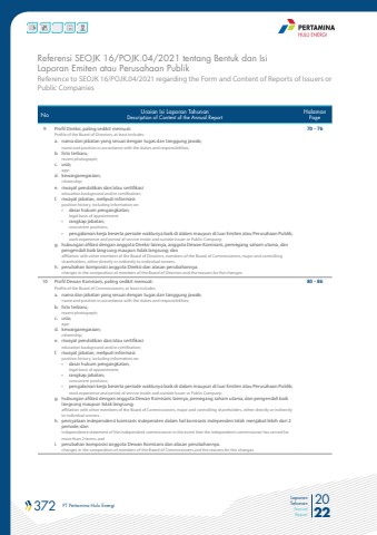 372 PT Pertamina Hulu Energi 2022Laporan TahunanAnnual ReportNo Uraian Isi Laporan TahunanDescription of Content of the Annual ReportHalamanPage9 Profil Direksi, paling sedikit memuat:Profile of the Board of Directors, at least includes:a. nama dan jabatan yang sesuai dengan tugas dan tanggung jawab;name and position in accordance with the duties and responsibilities;b. foto terbaru;recent photograph;c. usia;age;d. kewarganegaraan;citizenship;e. riwayat pendidikan dan/atau sertifikasieducation background and/or certification;f. riwayat jabatan, meliputi informasi:position history, including information on:%u2022 dasar hukum pengangkatan;legal basis of appointment;%u2022 rangkap jabatan;concurrent positions;%u2022 pengalaman kerja beserta periode waktunya baik di dalam maupun di luar Emiten atau Perusahaan Publik;work experience and period of service inside and outside Issuer or Public Company;g. hubungan afiliasi dengan anggota Direksi lainnya, anggota Dewan Komisaris, pemegang saham utama, dan pengendali baik langsung maupun tidak langsung; danaffiliation with other members of the Board of Directors, members of the Board of Commissioners, major and controlling shareholders, either directly or indirectly to individual owners. h. perubahan komposisi anggota Direksi dan alasan perubahannya.changes in the composition of members of the Board of Directors and the reasons for the changes. 70 - 7610 Profil Dewan Komisaris, paling sedikit memuat:Profile of the Board of Commissioners, at least includes:a. nama dan jabatan yang sesuai dengan tugas dan tanggung jawab;name and position in accordance with the duties and responsibilities;b. foto terbaru;recent photograph;c. usia;age;d. kewarganegaraan;citizenship;e. riwayat pendidikan dan/atau sertifikasieducation background and/or certification;f. riwayat jabatan, meliputi informasi:position history, including information on:%u2022 dasar hukum pengangkatan;legal basis of appointment;%u2022 rangkap jabatan;concurrent positions;%u2022 pengalaman kerja beserta periode waktunya baik di dalam maupun di luar Emiten atau Perusahaan Publik;work experience and period of service inside and outside Issuer or Public Company;g. hubungan afiliasi dengan anggota Dewan Komisaris lainnya, pemegang saham utama, dan pengendali baik langsung maupun tidak langsung;affiliation with other members of the Board of Commissioners, major and controlling shareholders, either directly or indirectly to individual owners.h. pernyataan independensi komisaris independen dalam hal komisaris independen telah menjabat lebih dari 2 periode; danindependence statement of the independent commissioner in the event that the independent commissioner has served for more than 2 terms; andi. perubahan komposisi anggota Dewan Komisaris dan alasan perubahannya.changes in the composition of members of the Board of Commissioners and the reasons for the changes. 80 - 86Reference to SEOJK 16/POJK.04/2021 regarding the Form and Content of Reports of Issuers or Public CompaniesReferensi SEOJK 16/POJK.04/2021 tentang Bentuk dan Isi Laporan Emiten atau Perusahaan Publik