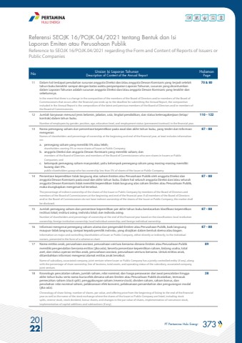 PT Pertamina Hulu Energi 373 2022Reference to SEOJK 16/POJK.04/2021 regarding the Form and Content of Reports of Issuers or Public CompaniesReferensi SEOJK 16/POJK.04/2021 tentang Bentuk dan Isi Laporan Emiten atau Perusahaan PublikNo Uraian Isi Laporan TahunanDescription of Content of the Annual ReportHalamanPage11 Dalam hal terdapat perubahan susunan anggota Direksi dan/atau anggota Dewan Komisaris yang terjadi setelah tahun buku berakhir sampai dengan batas waktu penyampaian Laporan Tahunan, susunan yang dicantumkan dalam Laporan Tahunan adalah susunan anggota Direksi dan/atau anggota Dewan Komisaris yang terakhir dan sebelumnya.In the event that there is a change in the composition of the members of the Board of Directors and/or members of the Board of Commissioners that occurs after the financial year ends up to the deadline for submitting the Annual Report, the composition included in the Annual Report is the composition of the latest and previous members of the Board of Directors and/or members of the Board of Commissioners.70 & 8012 Jumlah karyawan menurut jenis kelamin, jabatan, usia, tingkat pendidikan, dan status ketenagakerjaan (tetap/kontrak) dalam tahun buku.Number of employees by gender, position, age, education level, and employment status (permanent/contract) in the financial year.110 - 12213 Nama pemegang saham dan persentase kepemilikan pada awal dan akhir tahun buku, yang terdiri dari informasi mengenai: Names of shareholders and percentage of ownership at the beginning and end of the financial year, at least includes information on:a. pemegang saham yang memiliki 5% atau lebih;shareholders owning 5% or more shares of Issuer or Public Company;b. anggota Direksi dan anggota Dewan Komisaris yang memiliki saham; danmembers of the Board of Directors and members of the Board of Commissioners who own shares in Issuers or Public Companies; andc. kelompok pemegang saham masyarakat, yaitu kelompok pemegang saham yang masing-masing memiliki kurang dari 5%.public shareholders group who has ownership less than 5% of shares of the Issuer or Public Company.87 - 8814 Persentase kepemilikan tidak langsung atas saham Emiten atau Perusahaan Publik oleh anggota Direksi dan anggota Dewan Komisaris pada awal dan akhir tahun buku. Dalam hal seluruh anggota Direksi dan/atau seluruh anggota Dewan Komisaris tidak memiliki kepemilikan tidak langsung atas saham Emiten atau Perusahaan Publik, maka diungkapkan mengenai hal tersebut.The percentage of indirect ownership of the shares of the Issuer or Public Company by members of the Board of Directors and members of the Board of Commissioners at the beginning and end of the financial year. If all members of the Board of Directors and/or the Board of Commissioners do not have indirect ownership of the shares of the Issuer or Public Company, this matter shall be disclosed.87 - 8815 Jumlah pemegang saham dan persentase kepemilikan per akhir tahun buku berdasarkan klasifikasi: kepemilikan institusi lokal; institusi asing; individu lokal; dan individu asing.Number of shareholders and percentage of ownership at the end of the financial year based on the classification: local institution ownership; foreign institution ownership; local individual ownership; and foreign individual ownership.87 - 8816 Informasi mengenai pemegang saham utama dan pengendali Emiten atau Perusahaan Publik, baik langsung maupun tidak langsung, sampai kepada pemilik individu, yang disajikan dalam bentuk skema atau bagan. Information on major and controlling shareholders of Issuer or Public Company, either directly or indirectly, to the individual owners, presented in the form of a scheme or chart.87 - 8817 Nama entitas anak, perusahaan asosiasi, perusahaan ventura bersama dimana Emiten atau Perusahaan Publik memiliki pengendalian bersama entitas (jika ada), beserta persentase kepemilikan saham, bidang usaha, total aset, dan status operasi entitas anak, perusahaan asosiasi, perusahaan ventura bersama. Untuk entitas anak, ditambahkan informasi mengenai alamat entitas anak tersebut.Name of subsidiary, associated company, joint venture where Issuer or Public Company has a jointly controlled entity (if any), along with the percentage of share ownership, line of business, total assets, and operating status of the subsidiary, associated company, joint venture.8918 Kronologis pencatatan saham, jumlah saham, nilai nominal, dan harga penawaran dari awal pencatatan hingga akhir tahun buku serta nama bursa efek dimana saham Emiten atau Perusahaan Publik dicatatkan, termasuk pemecahan saham (stock split), penggabungan saham (reverse stock), dividen saham, saham bonus, dan perubahan nilai nominal saham, pelaksanaan efek konversi, pelaksanaan penambahan dan pengurangan modal (jika ada).Chronology of share listing, number of shares, par value, and offering price from the beginning of listing to the end of the financial year as well as the name of the stock exchange where the shares of the Issuer or Public Company are listed, including stock splits, reverse stock, stock dividend, bonus shares, and changes in the par value of shares, implementation of conversion stock, implementation of capital additions and subtractions (if any).28