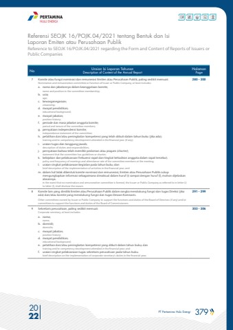 PT Pertamina Hulu Energi 379 2022Reference to SEOJK 16/POJK.04/2021 regarding the Form and Content of Reports of Issuers or Public CompaniesReferensi SEOJK 16/POJK.04/2021 tentang Bentuk dan Isi Laporan Emiten atau Perusahaan PublikNo Uraian Isi Laporan TahunanDescription of Content of the Annual ReportHalamanPage7 Komite atau fungsi nominasi dan remunerasi Emiten atau Perusahaan Publik, paling sedikit memuat:Nomination and remuneration committee or function of Issuer or Public Company, at least includes:a. nama dan jabatannya dalam keanggotaan komite;name and position in the committee membership;b. usia;age;c. kewarganegaraan;citizenship;d. riwayat pendidikan;educational background;e. riwayat jabatan;position history;f. periode dan masa jabatan anggota komite;period and tenure of the committee members;g. pernyataan independensi komite;independence statement of the committee;h. pelatihan dan/atau peningkatan kompetensi yang telah diikuti dalam tahun buku (jika ada);training and/or competency development attended in the financial year (if any);i. uraian tugas dan tanggung jawab;description of duties and responsibilities;j. pernyataan bahwa telah memiliki pedoman atau piagam (charter);statement that the committee has guidelines or charter;k. kebijakan dan pelaksanaan frekuensi rapat dan tingkat kehadiran anggota dalam rapat tersebut;policy and frequency of meetings and attendance rate of the committee members at the meeting;l. uraian singkat pelaksanaan kegiatan pada tahun buku; danbrief description of the implementation of activities in the financial year; andm. dalam hal tidak dibentuk komite nominasi dan remunerasi, Emiten atau Perusahaan Publik cukup mengungkapkan informasi sebagaimana dimaksud dalam huruf (i) sampai dengan huruf (l), mohon dijelaskan alasannya.in the event that no nomination and remuneration committee is formed, the Issuer or Public Company as referred to in letter (i) to letter (l), shall disclose the reason.280 - 3008 Komite lain yang dimiliki Emiten atau Perusahaan Publik dalam rangka mendukung fungsi dan tugas Direksi (jika ada) dan/atau komite yang mendukung fungsi dan tugas Dewan Komisaris.Other committees owned by Issuer or Public Company to support the functions and duties of the Board of Directors (if any) and/or committees to support the functions and duties of the Board of Commissioners.291 - 2999 Sekretaris perusahaan, paling sedikit memuat:Corporate secretary, at least includes:a. nama;name;b. domisili;domicile;c. riwayat jabatan;position history;d. riwayat pendidikan;educational background;e. pelatihan dan/atau peningkatan kompetensi yang diikuti dalam tahun buku; dantraining and/or competency development attended in the financial year; andf. uraian singkat pelaksanaan tugas sekretaris perusahaan pada tahun buku.brief description on the implementation of corporate secretary%u2019s duties in the financial year;303 - 306