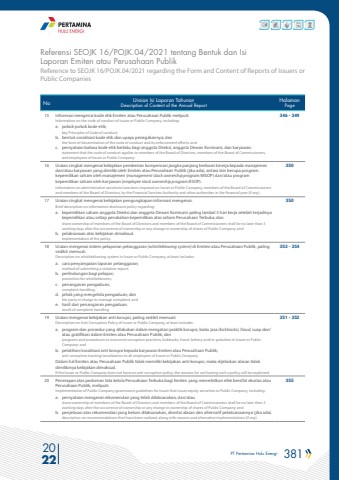 PT Pertamina Hulu Energi 381 2022Reference to SEOJK 16/POJK.04/2021 regarding the Form and Content of Reports of Issuers or Public CompaniesReferensi SEOJK 16/POJK.04/2021 tentang Bentuk dan Isi Laporan Emiten atau Perusahaan PublikNo Uraian Isi Laporan TahunanDescription of Content of the Annual ReportHalamanPage15 Informasi mengenai kode etik Emiten atau Perusahaan Publik meliputi:Information on the code of conduct of Issuer or Public Company, including:a. pokok-pokok kode etik;key Principles of Code of conduct;b. bentuk sosialisasi kode etik dan upaya penegakannya; danthe form of dissemination of the code of conduct and its enforcement efforts; andc. pernyataan bahwa kode etik berlaku bagi anggota Direksi, anggota Dewan Komisaris, dan karyawan.statement that the code of conduct applies to members of the Board of Directors, members of the Board of Commissioners, and employees of Issuer or Public Company.346 - 34916 Uraian singkat mengenai kebijakan pemberian kompensasi jangka panjang berbasis kinerja kepada manajemen dan/atau karyawan yang dimiliki oleh Emiten atau Perusahaan Publik (jika ada), antara lain berupa program kepemilikan saham oleh manajemen (management stock ownership program/MSOP) dan/atau program kepemilikan saham oleh karyawan (employee stock ownership program/ESOP).Information on administrative sanctions/sanctions imposed on Issuer or Public Company, members of the Board of Commissioners and members of the Board of Directors, by the Financial Services Authority and other authorities in the financial year (if any).35017 Uraian singkat mengenai kebijakan pengungkapan informasi mengenai:Brief description on information disclosure policy regarding:a. kepemilikan saham anggota Direksi dan anggota Dewan Komisaris paling lambat 3 hari kerja setelah terjadinya kepemilikan atau setiap perubahan kepemilikan atas saham Perusahaan Terbuka; danshare ownership of members of the Board of Directors and members of the Board of Commissioners shall be no later than 3 working days after the occurrence of ownership or any change in ownership of shares of Public Company; andb. pelaksanaan atas kebijakan dimaksud.implementation of the policy.35018 Uraian mengenai sistem pelaporan pelanggaran (whistleblowing system) di Emiten atau Perusahaan Publik, paling sedikit memuat:Description on whistleblowing system in Issuer or Public Company, at least includes:a. cara penyampaian laporan pelanggaran;method of submitting a violation report;b. perlindungan bagi pelapor;protection for whistleblowers;c. penanganan pengaduan;complaint handling;d. pihak yang mengelola pengaduan; danthe party in charge to manage complaint; ande. hasil dari penanganan pengaduan.result of complaint handling.353 - 35419 Uraian mengenai kebijakan anti korupsi, paling sedikit memuat:Description on Anti-Corruption Policy of Issuer or Public Company, at least includes:a. program dan prosedur yang dilakukan dalam mengatasi praktik korupsi, balas jasa (kickbacks), fraud, suap dan/atau gratifikasi dalam Emiten atau Perusahaan Publik; danprograms and procedures to overcome corruption practices, kickbacks, fraud, bribery and/or gratuities in Issuer or Public Company; andb. pelatihan/sosialisasi anti korupsi kepada karyawan Emiten atau Perusahaan Publik;anti-corruption training/socialization to all employees of Issuer or Public Company.Dalam hal Emiten atau Perusahaan Publik tidak memiliki kebijakan anti korupsi, maka dijelaskan alasan tidak dimilikinya kebijakan dimaksud.If the Issuer or Public Company does not have an anti-corruption policy, the reasons for not having such a policy will be explained.351 - 35220 Penerapan atas pedoman tata kelola Perusahaan Terbuka bagi Emiten yang menerbitkan efek bersifat ekuitas atau Perusahaan Publik, meliputi:implementation of Public Company governance guidelines for Issuer that issues equity securities or Public Company, including:a. pernyataan mengenai rekomendasi yang telah dilaksanakan; dan/ataushare ownership of members of the Board of Directors and members of the Board of Commissioners shall be no later than 3 working days after the occurrence of ownership or any change in ownership of shares of Public Company; andb. penjelasan atas rekomendasi yang belum dilaksanakan, disertai alasan dan alternatif pelaksanaannya (jika ada).description on recommendations that have been realized, along with reasons and alternative implementations (if any).355