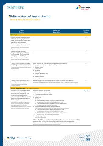 384 PT Pertamina Hulu Energi 2022Laporan TahunanAnnual ReportKriteria Annual Report AwardAnnual Report Award CriteriaKriteriaCriteriaPenjelasanDescriptionHalamanPageUmum | GeneralLaporan tahunan disajikan dalam bahasa Indonesia yang baik dan benar dan dianjurkan menyajikan juga dalam bahasa InggrisThe annual report is presented in proper and correct Bahasa Indonesia and is recommended to be presented in English as well- %u221aLaporan tahunan dicetak dengan kualitas yang baik dan menggunakan jenis dan ukuran huruf yang mudah dibacaThe annual report is printed in fine quality, with easy-to-read font types and sizes.- %u221aLaporan tahunan mencantumkan identitas perusahaan dengan jelasThe annual report presents clear identity of the companyNama perusahaan dan tahun annual report ditampilkan di:Company name and the year of the Annual Report are shown in:1. Sampul muka;Front cover;2. Samping;Side margin;3. Sampul belakang; danBack cover; and4. Setiap halaman.Each page.%u221aLaporan tahunan ditampilkan di website perusahaanThe annual report is available at company websiteMencakup laporan tahunan terkini dan paling kurang 4 tahun terakhir.Including current annual report and the annual reports from at least the last four (4) years.%u221aIkhtisar Data Keuangan | Key Financial HighlightsInformasi hasil usaha perusahaan dalam bentuk perbandingan selama 3 (tiga) tahun buku atau sejak memulai usahanya jika perusahaan tersebut menjalankan kegiatan usahanya selama kurang dari 3 (tiga) tahunInformation on Company%u2019s operatingresults with comparisons of 3 (three) fiscal years or since the startingof the company if the business activities have run for less than three (3) yearsInformasi memuat antara lain:The information encloses, among others:1. Penjualan/pendapatan usaha;Sales/revenues;2. Laba (rugi):Profit (loss):a. Diatribusikan kepada pemilik entitas induk; danAttributable to the owner of the holding entity; andb. Diatribusikan kepada kepentingan non pengendali.Attributable to non-controlling interest3. Penghasilan komprehensif periode berjalan:Total comprehensive profit (loss) and other comprehensive income:a. Diatribusikan kepada pemilik entitas induk; danAttributable to the owner of the holding entity; andb. Diatribusikan kepada kepentingan non pengendali.Attributable to non-controlling interest; and4. Laba (rugi) per saham.Profit (Loss) per ShareCatatan: Apabila perusahaan tidak memiliki entitas anak, perusahaan menyajikan laba (rugi) dan penghasilan komprehensif periode berjalan secara total.Note: For a company with no subsidiaries, the company presents the profit (loss) and otherprofit (loss) and other comprehensive income in total.23 - 27