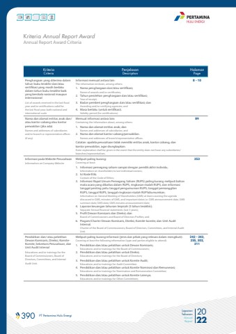 390 PT Pertamina Hulu Energi 2022Laporan TahunanAnnual ReportAnnual Report Award CriteriaKriteria Annual Report AwardKriteriaCriteriaPenjelasanDescriptionHalamanPagePenghargaan yang diterima dalam tahun buku terakhir dan/atau sertifikasi yang masih berlaku dalam tahun buku terakhir baik yang berskala nasional maupun internasionalList of awards received in the last fiscal year and/or certifications valid for the last fiscal year, both national and international-scaleInformasi memuat antara lain:The information encloses, among others:1. Nama penghargaan dan/atau sertifikasi;Name of awards and/or certificates;2. Tahun perolehan penghargaan dan/atau sertifikasi;Year of receipt;3. Badan pemberi penghargaan dan/atau sertifikasi; danAwarding and/or certifying agencies; and4. Masa berlaku (untuk sertifikasi).Validity period (for certifications).8 - 10Nama dan alamat entitas anak dan/atau kantor cabang atau kantor perwakilan (jika ada)Names and addresses of subsidiaries and/or branch or representative offices (if any)Memuat informasi antara lain:Containing the information about, among others:1. Nama dan alamat entitas anak; danNames and addresses of subsidiaries; and2. Nama dan alamat kantor cabang/perwakilan.Names and addresses of branch/representative offices.Catatan: apabila perusahaan tidak memiliki entitas anak, kantor cabang, dan kantor perwakilan, agar diungkapkan.Note: explanation shall be given in the event that the entity does not have any subsidiaries/branches/representatives.89Informasi pada Website PerusahaanInformation on Company WebsiteMeliputi paling kurang:Covering at least:1. Informasi pemegang saham sampai dengan pemilik akhir individu;Information on shareholders to last individual owners;2. Isi Kode Etik;Contain of the Code of Ethics;3. Informasi Rapat Umum Pemegang Saham (RUPS) paling kurang meliputi bahan mata acara yang dibahas dalam RUPS, ringkasan risalah RUPS, dan informasi tanggal penting yaitu tanggal pengumuman RUPS, tanggal pemanggilan RUPS, tanggal RUPS, tanggal ringkasan risalah RUPSdiumumkan;Information on General Meeting of Shareholders (GMS) at least covering the agenda discussed in GMS, minutes of GMS, and important dates i.e. GMS announcement date, GMS summon date, GMS date, GMS minutes announcement date;4. Laporan keuangan tahunan terpisah (5 tahun terakhir);Separate Annual financial statements (last 5 years);5. Profil Dewan Komisaris dan Direksi; danBoard of Commissioners and Board of Directors Profiles; and6. Piagam/Charter Dewan Komisaris, Direksi, Komite-komite, dan Unit Audit Internal.Charter of the Board of Commissioners, Board of Directors, Committees, and Internal AuditUnit.353Pendidikan dan/ atau pelatihan Dewan Komisaris, Direksi, KomiteKomite, Sekretaris Perusahaan, dan Unit Audit InternalEducations and/or trainings for the Board of Commissioners, Board of Directors, Committees, and Internal Audit Unit.Meliputi paling kurang informasi (jenis dan pihak yang relevan dalam mengikuti):Covering at least the following information (type and parties eligible to attend):1. Pendidikan dan/atau pelatihan untuk Dewan Komisaris;Educations and/or trainings for the Board of Commissioners;2. Pendidikan dan/atau pelatihan untuk Direksi;Educations and/or trainings for the Board of Directors;3. Pendidikan dan/atau pelatihan untuk Komite Audit;Educations and/or trainings for Audit Committee;4. Pendidikan dan/atau pelatihan untuk Komite Nominasi dan Remunerasi;Educations and/or trainings for Nomination and Remuneration Committee;5. Pendidikan dan/atau pelatihan untuk Komite Lainnya;Educations and/or trainings for Other Committees;242 - 243, 255, 303, 311