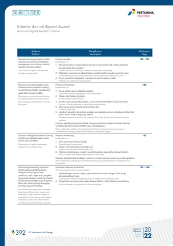 392 PT Pertamina Hulu Energi 2022Laporan TahunanAnnual ReportKriteriaCriteriaPenjelasanDescriptionHalamanPageBahasan tentang struktur modal (capital structure) dan kebijakan manajemen atas struktur modal (capital structure policy)Discussion on capital structure and capital structure policyPenjelasan atas:Explanation on:1. Rincian struktur modal (capital structure) yang terdiri dari utang berbasis bunga/sukuk dan ekuitas;Capital structure, consisting of interest-based debts and equity;2. Kebijakan manajemen atas struktur modal (capital structure policies); danManagement policies on the capital structure (capital structure policies); and3. Dasar pemilihan kebijakan manajemen atas struktur modal.The basis for Capital structure policies.180 - 181Bahasan mengenai ikatan yang material untuk investasi barang modal (bukan ikatan pendanaan) pada tahun buku terakhirDiscussion on material commitments for capital goods investments (other than funding commitment) in the last fiscal yearPenjelasan tentang:Explanation on:1. Nama pihak yang melakukan ikatan;The name of parties engaging in the commitment2. Tujuan dari ikatan tersebut;Purpose of the commitments;3. Sumber dana yang diharapkan untuk memenuhi ikatan-ikatan tersebut;Sources of funds expected to meet these commitments;4. Mata uang yang menjadi denominasi; danCurrency used; and5. Langkah-langkah yang direncanakan perusahaan untuk melindungi risiko dari posisi mata uang asing yang terkait.Planned measures to protect the company from risks arising from relevant currency position.Catatan: apabila perusahaan tidak mempunyai ikatan terkait investasi barang modal pada tahun buku terakhir agar diungkapkan.Note: explanation shall be given in the event that the company does not have any commitments relating to capital investments in the last fiscal year.182Bahasan mengenai investasi barang modal yang direalisasikan pada tahun buku terakhirDiscussion on capital investments realized in the last fiscal yearPenjelasan tentang:Explanation on:1. Jenis investasi barang modal;Type of capital investments;2. Tujuan investasi barang modal; danPurposes of the capital investments; and3. Nilai investasi barang modal yang dikeluarkan pada tahun buku terakhir.Value of capital investment spent in the last fiscal year.Catatan: apabila tidak terdapat realisasi investasi barang modal, agar diungkapkan.Note: explanation shall be given in the event that any capital investment realizations arenonexistent182Informasi perbandingan antara target pada awal tahun buku dengan hasil yang dicapai (realisasi), dan target atau proyeksi yang ingin dicapai untuk satu tahun mendatang mengenai pendapatan, laba, dan lainnya yang dianggap penting bagi perusahaanInformation on comparisons betweenbeginning of fiscal year%u2019s targets and realizations, and expected targets or projection for the coming year relating to revenue, profit, and other matters considered important to the companyInformasi memuat antara lain:The information encloses, among others:1. Perbandingan antara target pada awal tahun buku dengan hasil yang dicapai(realisasi); danComparisons between beginning of year%u2019s targets and realizations; and2. Target atau proyeksi yang ingin dicapai dalam 1 (satu) tahun mendatang.Expected targets or projection for the coming year.183 - 188Annual Report Award CriteriaKriteria Annual Report Award