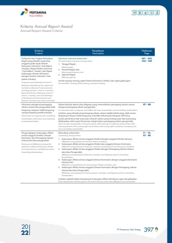 PT Pertamina Hulu Energi 397 2022Annual Report Award CriteriaKriteria Annual Report AwardKriteriaCriteriaPenjelasanDescriptionHalamanPageFrekuensi dan Tingkat Kehadiran Rapat yang dihadiri mayoritas anggota pada rapat Dewan Komisaris (minimal 1 kali dalam 2 bulan), Rapat Direksi (minimal 1 kali dalam 1 bulan), dan Rapat Gabungan Dewan Komisaris dengan Direksi (minimal 1 kali dalam 4 bulan)Frequency and Attendance Level of Meetings attended by the majority of members at Board of Commissioners meetings (at least 1 time in 2 months), Board of Directors Meetings (at least 1 time in 1 month), and Joint Meetings of the Board of Commissioners and Directors (at least once every 4 months)Informasi memuat antara lain: The information encloses, among others: 1. Tanggal Rapat; Meeting date; 2. Peserta Rapat; dan Meeting participants; and 3. Agenda Rapat. Meeting agenda Untuk masing-masing rapat Dewan Komisaris, Direksi, dan rapat gabungan.For each BOC meeting, BOD meeting, and joint meeting241 - 242, 253 - 254Informasi mengenai pemegang saham utama dan pengendali, baik langsung maupun tidak langsung, sampai kepada pemilik individuInformation on majority and controlling shareholders, both direct and indirectly, to individual holdersDalam bentuk skema atau diagram yang memisahkan pemegang saham utama dengan pemegang saham pengendali. In schematic chart or diagram, that differs the main shareholders and controlling shareholders. Catatan: yang dimaksud pemegang saham utama adalah pihak yang, baik secara langsung maupun tidak langsung, memiliki sekurang-kurangnya 20% (dua puluh perseratus) hak suara dari seluruh saham yang mempunyai hak suara yang dikeluarkan oleh suatu Perseroan, tetapi bukan pemegang saham pengendali.Note: he main shareholder is the party which, either directly or indirectly, holds at least 20% (twenty percent) of the voting rights of all shares with voting rights issued by a company, but not a controlling shareholder87 - 88Pengungkapan hubungan afiliasi antara anggota Direksi, Dewan Komisaris, dan Pemegang Saham Utama dan/atau pengendaliDisclosure of affiliations among the members of Board of Directors, Board of Commissioners, and Majority and/or Controlling ShareholdersMencakup antara lain: Containing, among others: 1. Hubungan afiliasi antara anggota Direksi dengan anggota Direksi lainnya; Affiliations among Board of Directors%u2019 fellow members; 2. Hubungan afiliasi antara anggota Direksi dan anggota Dewan Komisaris; Affiliations among Board of Directors members and Board of Commissioners members; 3. Hubungan afiliasi antara anggota Direksi dengan Pemegang Saham Utama dan/atau Pengendali; Affiliations among Board of Directors members and Majority and/or Controlling Shareholders; 4. Hubungan afiliasi antara anggota Dewan Komisaris dengan anggota Komisaris lainnya; dan Affiliations among Board of Commissioners%u2019 fellow members; and 5. Hubungan afiliasi antara anggota Dewan Komisaris dengan Pemegang Saham Utama dan/atau Pengendali. Affiliations among Board of Commissioners%u2019%u2019 members and Majority and/or Controlling Shareholders. Catatan: apabila tidak mempunyai hubungan afiliasi dimaksud, agar diungkapkan.Note: explanation shall be given in the event that any concerned affiliations are nonexistent.71 - 76, 81 - 86