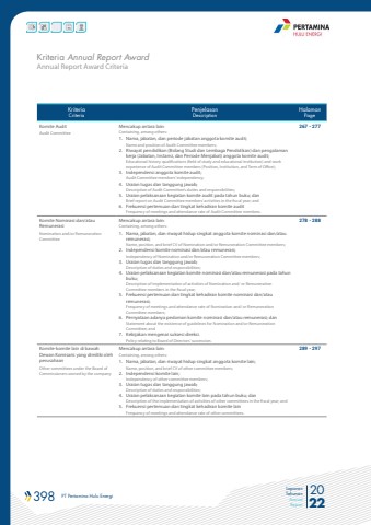 398 PT Pertamina Hulu Energi 2022Laporan TahunanAnnual ReportKriteriaCriteriaPenjelasanDescriptionHalamanPageKomite AuditAudit CommitteeMencakup antara lain: Containing, among others: 1. Nama, jabatan, dan periode jabatan anggota komite audit; Name and position of Audit Committee members; 2. Riwayat pendidikan (Bidang Studi dan Lembaga Pendidikan) dan pengalaman kerja (Jabatan, Instansi, dan Periode Menjabat) anggota komite audit; Educational history qualifications (field of study and educational institution) and work experience of Audit Committee members (Position, Institution, and Term of Office); 3. Independensi anggota komite audit; Audit Committee members%u2019 independency; 4. Uraian tugas dan tanggung jawab; Description of Audit Committee%u2019s duties and responsibilities; 5. Uraian pelaksanaan kegiatan komite audit pada tahun buku; dan Brief report on Audit Committee members%u2019 activities in the fiscal year; and 6. Frekuensi pertemuan dan tingkat kehadiran komite auditFrequency of meetings and attendance rate of Audit Committee members.267 - 277Komite Nominasi dan/atau RemunerasiNomination and/or Remuneration CommitteeMencakup antara lain: Containing, among others: 1. Nama, jabatan, dan riwayat hidup singkat anggota komite nominasi dan/atau remunerasi; Name, position, and brief CV of Nomination and/or Remuneration Committee members; 2. Independensi komite nominasi dan/atau remunerasi; Independency of Nomination and/or Remuneration Committee members; 3. Uraian tugas dan tanggung jawab; Description of duties and responsibilities; 4. Uraian pelaksanaan kegiatan komite nominasi dan/atau remunerasi pada tahun buku; Description of implementation of activities of Nomination and/ or Remuneration Committee members in the fiscal year; 5. Frekuensi pertemuan dan tingkat kehadiran komite nominasi dan/atau remunerasi; Frequency of meetings and attendance rate of Nomination and/ or Remuneration Committee members; 6. Pernyataan adanya pedoman komite nominasi dan/atau remunerasi; dan Statement about the existence of guidelines for Nomination and/or Remuneration Committee; and 7. Kebijakan mengenai suksesi direksi.Policy relating to Board of Directors%u2019 succession.278 - 288Komite-komite lain di bawah Dewan Komisaris yang dimiliki oleh perusahaanOther committees under the Board of Commissioners owned by the companyMencakup antara lain: Containing, among others: 1. Nama, jabatan, dan riwayat hidup singkat anggota komite lain; Name, position, and brief CV of other committee members; 2. Independensi komite lain; Independency of other committee members; 3. Uraian tugas dan tanggung jawab; Description of duties and responsibilities; 4. Uraian pelaksanaan kegiatan komite lain pada tahun buku; dan Description of the implementation of activities of other committees in the fiscal year; and 5. Frekuensi pertemuan dan tingkat kehadiran komite lainFrequency of meetings and attendance rate of other committees.289 - 297Annual Report Award CriteriaKriteria Annual Report Award