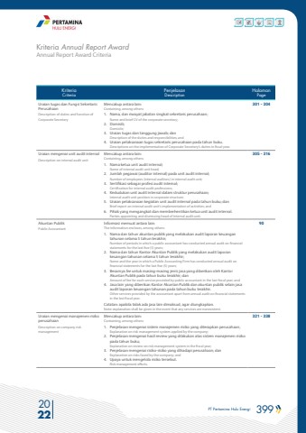 PT Pertamina Hulu Energi 399 2022Annual Report Award CriteriaKriteria Annual Report AwardKriteriaCriteriaPenjelasanDescriptionHalamanPageUraian tugas dan Fungsi Sekretaris PerusahaanDescription of duties and function of Corporate SecretaryMencakup antara lain: Containing, among others: 1. Nama, dan riwayat jabatan singkat sekretaris perusahaan; Name and brief CV of the corporate secretary; 2. Domisili; Domicile; 3. Uraian tugas dan tanggung jawab; dan Description of the duties and responsibilities; and 4. Uraian pelaksanaan tugas sekretaris perusahaan pada tahun buku.Descriptions on the implementation of Corporate Secretary%u2019s duties in fiscal year. 301 - 304Uraian mengenai unit audit internalDescription on internal audit unitMencakup antara lain: Containing, among others: 1. Nama ketua unit audit internal; Name of internal audit unit head; 2. Jumlah pegawai (auditor internal) pada unit audit internal; Number of employees (internal auditors) in internal audit unit; 3. Sertifikasi sebagai profesi audit internal; Certification for internal audit professions; 4. Kedudukan unit audit internal dalam struktur perusahaan; Internal audit unit position in corporate structure; 5. Uraian pelaksanaan kegiatan unit audit internal pada tahun buku; dan Brief report on internal audit unit%u2019s implementation of activities; and 6. Pihak yang mengangkat dan memberhentikan ketua unit audit internal.Parties appointing and dismissing head of internal audit unit.305 - 316Akuntan PublikPublic AccountantInformasi memuat antara lain: The information encloses, among others: 1. Nama dan tahun akuntan publik yang melakukan audit laporan keuangan tahunan selama 5 tahun terakhir; Number of periods in which a public accountant has conducted annual audit on financial statements for the last five (5) years; 2. Nama dan tahun Kantor Akuntan Publik yang melakukan audit laporan keuangan tahunan selama 5 tahun terakhir; Name and the year in which a Public Accounting Firm has conducted annual audit on financial statements for the last five (5) years; 3. Besarnya fee untuk masing-masing jenis jasa yang diberikan oleh Kantor Akuntan Publik pada tahun buku terakhir; dan Amount of fee for each service provided by public accountant in the last fiscal year; and 4. Jasa lain yang diberikan Kantor Akuntan Publik dan akuntan publik selain jasa audit laporan keuangan tahunan pada tahun buku terakhir. Other services provided by the accountant apart from annual audit on financial statements in the last fiscal year. Catatan: apabila tidak ada jasa lain dimaksud, agar diungkapkan.Note: explanation shall be given in the event that any services are nonexistent.90Uraian mengenai manajemen risiko perusahaanDescription on company risk managementMencakup antara lain: Containing, among others: 1. Penjelasan mengenai sistem manajemen risiko yang diterapkan perusahaan; Explanation on risk management system applied by the company; 2. Penjelasan mengenai hasil review yang dilakukan atas sistem manajemen risiko pada tahun buku; Explanation on review on risk management system in the fiscal year; 3. Penjelasan mengenai risiko-risiko yang dihadapi perusahaan; dan Explanation on risks faced by the company; and 4. Upaya untuk mengelola risiko tersebut.Risk management efforts.321 - 338