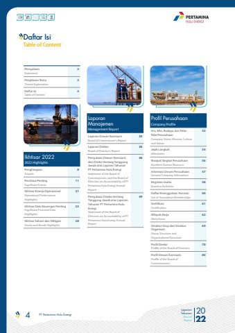4 PT Pertamina Hulu Energi 2022Laporan TahunanAnnual ReportDaftar IsiTable of ContentIkhtisar 20222022 HighlightsPenghargaanAwards8Peristiwa PentingSignificant Events11Ikhtisar Kinerja OperasionalOperational Performance Highlights21Ikhtisar Data Keuangan PentingSignificant Financial Data Highlights23Ikhtisar Saham dan ObligasiStocks and Bonds Highlights28Laporan ManajemenManagement ReportLaporan Dewan KomisarisBoard of Commisioner%u2019s Report30Laporan DireksiBoard of Director%u2019s Report38Pernyataan Dewan Komisarisdan Direksi tentang TanggungJawab atas Laporan Tahunan PT Pertamina Hulu EnergiStatement of the Board ofCommissioners and the Board ofDirectors on Accountability of PTPertamina Hulu Energi AnnualReport48Pernyataan Direksi tentangTanggung Jawab atas LaporanTahunan PT Pertamina HuluEnergiStatement of the Board ofDirectors on Accountability of PTPertamina Hulu Energi AnnualReport49Profil PerusahaanCompany ProfileVisi, Misi, Budaya, dan NilaiNilai PerusahaanCompany Vision, Mission, Culture and Values52Jejak LangkahMilestones54Riwayat Singkat PerusahaanExcellent Human Resource56Informasi Umum PerusahaanGeneral Company Information57Kegiatan UsahaBusiness Activities58Daftar Keanggotaan AsosiasiList of Association Memberships60SertifikasiCertification61Wilayah KerjaWork Areas62Struktur Grup dan Struktur OrganisasiGroup Structure and Organizational Structure64Profil DireksiProfile of the Board of Directors70Profil Dewan KomisarisProfile of the Board ofCommissioners80PernyataanStatement2Penjelasan TemaTheme Explanation3Daftar IsiTable of Content4