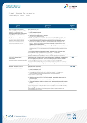 404 PT Pertamina Hulu Energi 2022Laporan TahunanAnnual ReportKriteriaCriteriaPenjelasanDescriptionHalamanPagePerkara penting yang sedang dihadapi oleh perusahaan, entitas anak, serta anggota Dewan Komisaris dan anggota Direksi yang menjabat pada periode laporan tahunanSignificant cases currently faced by the company, subsidiaries, and Board of Directors and/ or Board of Commissioners member(s) serving during the annual report periodMencakup antara lain: Covering, among others: 1. Pokok perkara/gugatan; Principal case/lawsuit; 2. Status penyelesaian perkara/gugatan; Dispute/lawsuit settlement status; 3. Risiko yang dihadapi perusahaan dan nilai nominal tuntutan/gugatan; dan Risk faced by the company and amount of dispute/lawsuit settlement; and 4. Sanksi administrasi yang dikenakan kepada perusahaan, anggota Dewan Komisaris dan Direksi, oleh otoritas terkait (pasar modal, perbankan dan lainnya) pada tahun buku terakhir (atau terdapat pernyataan bahwa tidak dikenakan sanksi administrasi). Administrative sanctions imposed to the company, Board of Commissioners and Board of Directors members, by relevant authorities (capital market, banking, and others) for the latest fiscal year (or if any statement confirming no imposition of administrative sanction exists). Catatan: dalam hal perusahaan, entitas anak, anggota Dewan Komisaris, dan anggota Direksi tidak memiliki perkara penting, agar diungkapkan.Note: explanation shall be given in the event that any significant cases faced by the company, subsidiaries, Board of Commissioners and Board of Directors members are nonexistent.339 - 343Akses informasi dan data perusahaanAccess to company information and dataUraian mengenai tersedianya akses informasi dan data perusahaan kepada publik, misalnya melalui website (dalam bahasa Indonesia dan bahasa Inggris), media massa, mailing list, buletin, pertemuan dengan analis, dan sebagainya.Description on the availability of company information and data to public, such as through website (in Bahasa Indonesia and English), mass media, mailing list, bulletin, analyst meeting, etc.353Bahasan mengenai kode etikDiscussion on code of conductMemuat uraian antara lain: Consisting description, among others on: 1. Pokok-pokok kode etik; Code of conduct contents; 2. Pengungkapan bahwa kode etik berlaku bagi seluruh level organisasi; Disclosure that the code of conduct applies to all levels of organization; 3. Penyebarluasan kode etik; Dissemination of the code of conduct; 4. Sanksi untuk masing-masing jenis pelanggaran yang diatur dalam kode etik (normatif); dan Types of sanction for each code of conduct violation; and 5. Jumlah pelanggaran kode etik beserta sanksi yang diberikan pada tahun buku terakhir. Number of code of conduct violation and the sanctions imposed in the last fiscal year. Catatan: apabila tidak terdapat pelanggaran kode etik pada tahun buku terakhir, agar diungkapkan.Note: explanation shall be given in the event that any codes of conduct violations are nonexistent in the last fiscal year.344 -346Annual Report Award CriteriaKriteria Annual Report Award