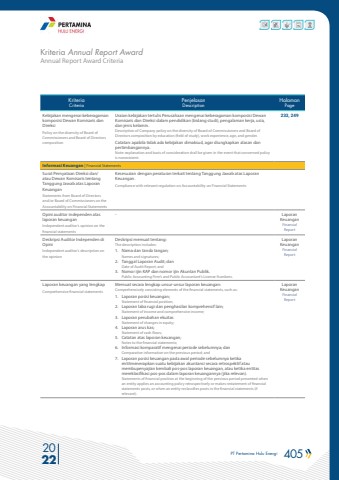 PT Pertamina Hulu Energi 405 2022Annual Report Award CriteriaKriteria Annual Report AwardKriteriaCriteriaPenjelasanDescriptionHalamanPageKebijakan mengenai keberagaman komposisi Dewan Komisaris dan DireksiPolicy on the diversity of Board of Commissioners and Board of Directors compositionUraian kebijakan tertulis Perusahaan mengenai keberagaman komposisi Dewan Komisaris dan Direksi dalam pendidikan (bidang studi), pengalaman kerja, usia, dan jenis kelamin. Description of Company policy on the diversity of Board of Commissioners and Board of Directors composition by education (field of study), work experience, age, and gender. Catatan: apabila tidak ada kebijakan dimaksud, agar diungkapkan alasan dan pertimbangannya.Note: explanation and basis of consideration shall be given in the event that concerned policy is nonexistent.233, 249Informasi Keuangan | Financial StatementsSurat Pernyataan Direksi dan/atau Dewan Komisaris tentang Tanggung Jawab atas Laporan KeuanganStatements from Board of Directors and/or Board of Commissioners on the Accountability on Financial StatementsKesesuaian dengan peraturan terkait tentang Tanggung Jawab atas Laporan Keuangan.Compliance with relevant regulation on Accountability on Financial StatementsOpini auditor independen atas laporan keuanganIndependent auditor%u2019s opinion on the financial statements- Laporan Keuangan Financial ReportDeskripsi Auditor Independen di OpiniIndependent auditor%u2019s description on the opinionDeskripsi memuat tentang: The description includes:1. Nama dan tanda tangan; Names and signatures; 2. Tanggal Laporan Audit; dan Date of Audit Report; and 3. Nomor ijin KAP dan nomor ijin Akuntan Publik.Public Accounting Firm%u2019s and Public Accountant%u2019s License Numbers.Laporan Keuangan Financial ReportLaporan keuangan yang lengkapComprehensive financial statementsMemuat secara lengkap unsur-unsur laporan keuangan: Comprehensively consisting elements of the financial statements, such as: 1. Laporan posisi keuangan; Statement of financial position; 2. Laporan laba rugi dan penghasilan komprehensif lain; Statement of income and comprehensive income; 3. Laporan perubahan ekuitasStatement of changes in equity; 4. Laporan arus kas; Statement of cash flows; 5. Catatan atas laporan keuangan; Notes to the financial statements; 6. Informasi komparatif mengenai periode sebelumnya; dan Comparative information on the previous period; and 7. Laporan posisi keuangan pada awal periode sebelumnya ketika entitmenerapkan suatu kebijakan akuntansi secara retrospektif atau membupenyajian kembali pos-pos laporan keuangan, atau ketika entitas mereklasifikasi pos-pos dalam laporan keuangannya (jika relevan). Statements of financial position at the beginning of the previous period presented when an entity applies an accounting policy retrospectively or makes restatement of financial statements posts, or when an entity reclassifies posts in the financial statements (if relevant).Laporan Keuangan Financial Report