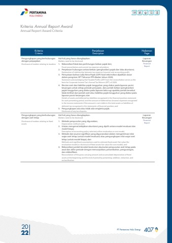 PT Pertamina Hulu Energi 407 2022Annual Report Award CriteriaKriteria Annual Report AwardKriteriaCriteriaPenjelasanDescriptionHalamanPagePengungkapan yang berhubungan dengan perpajakanDisclosure of matters relating to taxationHal-hal yang harus diungkapkan:Matters need to be disclosed: 1. Rekonsiliasi fiskal dan perhitungan beban pajak kini;Fiscal reconciliation and current tax expense calculation; 2. Penjelasan hubungan antara beban (penghasilan) pajak dan laba akuntansi;Explanation of relationship between tax expense (income) and accounting profit; 3. Pernyataan bahwa Laba Kena Pajak (LKP) hasil rekonsiliasi dijadikan dasar dalam pengisian SPT Tahunan PPh Badan tahun 2020;Statement acknowledging that Taxable Profits (LKP) from the reconciliation serves as the basis for Corporate Income Tax%u2019s Annual Tax Returns (SPT) of 2020; 4. Rincian aset dan liabilitas pajak tangguhan yang diakui pada laporan posisi keuangan untuk setiap periode penyajian, dan jumlah beban (penghasilan) pajak tangguhan yang diakui pada laporan laba rugi apabila jumlah tersebut tidak terlihat dari jumlah aset atau liabilitas pajak tangguhan yang diakui pada laporan posisi keuangan; danDetails of assets and deferred tax liabilities recognized in the financial position statement for each presenting period, and the amount of deferred tax (income) expenses recognized in the income statements if the amount is not visible in the total assets or liabilities of deferred tax recognized in the statements of financial position; and 5. Pengungkapan ada atau tidak ada sengketa pajak.Disclosure of any tax disputes.Laporan Keuangan Financial ReportPengungkapan yang berhubungan dengan aset tetapDisclosure of matters relating to fixed assetsHal-hal yang harus diungkapkan:Matters need to be disclosed: 1. Metode penyusutan yang digunakan;Depreciation method used; 2. Uraian mengenai kebijakan akuntansi yang dipilh antara model revaluasi dan model biaya;Description of accounting policy selected, either revaluation or cost model; 3. Metode dari asumsi signifikan yang digunanakan dalam mengestimasi nilai wajar aset tetap (untuk model revaluasi) atau pengungkapan nilai wajar aset tetap (untuk model biaya); dan Methods and significant assumptions used to estimate fixed assets%u2019 fair value (for revaluation model) or disclosure of fixed assets%u2019 fair value (for cost model); and 4. Rekonsiliasi jumlah tercatat bruto dan akumulasi penyusutan aset tetap pada awal dan akhir periode dengan menunjukkan; penambahan, pengurangan, dan reklasifikasi.Reconciliation of the gross carrying amount and accumulated depreciation of fixed assets at the beginning and the end of period by presenting: addition, reduction, and reclassification.Laporan Keuangan Financial Report