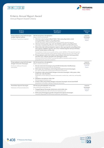 408 PT Pertamina Hulu Energi 2022Laporan TahunanAnnual ReportAnnual Report Award CriteriaKriteria Annual Report AwardKriteriaCriteriaPenjelasanDescriptionHalamanPagePengungkapan yang berhubungan dengan segmen operasiDisclosure of operational segmentHal-hal yang harus diungkapkan:Matters need to be disclosed: 1. Informasi umum yang meliputi faktor-fakor yang digunakan untuk mengidentifikasi segmen yang dilaporkan;General information covering the factors used to identify reported segment; 2. Informasi tentang laba rugi, aset, dan liabilitas segmen yang dilaporkan;Information regarding profit and loss, assets, and liabilities of the reported segment; 3. Rekonsiliasi dari total pendapatan segmen, laba rugi segmen yang dilaporkan, aset segmen, liabilitas segmen, dan unsur material segmen lainnya terhadap jumlah terkait dalam entitas; danReconciliation of total revenue, profit and loss, assets, liabilities of the reported segment, and other material elements of the segment against relevant amount in the entity; and 4. Pengungkapan pada level entitas, yang meliputi informasi tentang produk dan/atau jasa, wilayah geografis dan pelanggan utama.Disclosure at the level of entity, covering information on products and/or services, geographical area, and main customers.Laporan Keuangan Financial ReportPengungkapan yang berhubungan dengan Instrumen KeuanganDisclosure relating to Financial InstrumentsHal-hal yang harus diungkapkan:Matters need to be disclosed: 1. Rincian instrumen keuangan yang dimiliki berdasarkan klasifikasinya;Detailed of financial instruments by classification; 2. Nilai wajar dan hirarkinya untuk setiap kelompok istrumen keuangan;Fair value and hierarchy of each group of financial instruments; 3. Penjelasan risiko yang terkait dengan insturmen keuangan: risiko pasar, risiko kredit, dan risiko likuiditas;Explanation of risks relating to financial instruments: market risks, credit risks, and liquidity risks; 4. Kebijakan manajemen risiko; danRisk management policies; and 5. Analisis risiko yang terkait dengan instrumen keuangan secara kuantitatif.Quantitative risk analysis relating to financial instruments.Laporan Keuangan Financial ReportPenerbitan laporan keuanganPublication of financial statementsHal-hal yang diungkapkan antara lain:Items disclosed among others are: 1. Tanggal laporan keuangan diotorisasi untuk terbit; danAuthorized publication date of the financial statements; and 2. Pihak yang bertanggung jawab mengotorisasi laporan keuangan.The party responsible for the financial statements authorization.Laporan Keuangan Financial Report