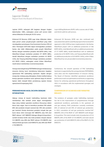 PT Pertamina Hulu Energi 41 2022Laporan TahunanAnnual ReportLaporan ManajemenManagement ReportLapisan (KUPL) sebanyak 638 kegiatan dengan tingkat keberhasilan 108%, sedangkan untuk well service telah selesai dilakukan di sebanyak 29.352 sumur. Enhanced Oil Recovery (EOR) juga tetap dilakukan dalam skala penuh untuk proyek-proyek waterflood yang telah mendapatkan persetujuan Final Investment Decision (FID) di 2022. Penerapan EOR telah dapat meningkatkan produksi harian, dan telah dilaksanakan pada proyek WaterfloodRantau dengan tambahan produksi 366 BOPD (69%), Jirak Waterflood dengan tambahan produksi 371 BOPD (88%), Handil Waterflood dengan tambahan produksi 45 BOPD (16%), dan Tanjung Waterflood dengan tambahan produksi 619 BOPD (106%), sedangkan untuk E-Main Waterfloodmasih belum memberikan incremental produksi.Sinergi antarwilayah kerja PERTAMINA dengan terlaksananya resources sharing turut mendukung kelancaran kegiatan operasional PHE Subholding Upstream. Sejalan dengan sinergi dan strategi yang diterapkan, Direksi melihat bahwa kinerja operation excellence serta optimasi biaya di seluruh lapisan telah menjadi faktor pendukung capaian kinerja operasional di sepanjang 2022.PERBANDINGAN HASIL DICAPAI DENGAN DITARGETKANAdanya sinergi di bawah Subholding Upstream telah memberikan nilai tambah untuk dapat meningkatkan daya saing melalui operation excellence khususnya dalam bisnis hulu migas. Saat ini kontribusi produksi PHE adalah 84% dari produksi minyak nasional dan 49% dari produksi gas nasional. Kinerja akumulasi produksi minyak dan gas bumi tahun 2022 mencapai 967 MBOEPD, atau 92% dari RKAP sebesar 1.047 MBOEPD (dengan Merger & Acquisition). Jumlah tersebut terdiri atas total produksi minyak sebesar 514 MBOPD, atau 89% dari RKAP sebesar 576 MBOPD; dan total produksi gas bumi 2.624 MMSCFD, atau 96% dari RKAP 2.726 MMSCFD. Layer-shifting Workovers (KUPL) with a success rate of 108%, and 29,352 wells for well services.Enhanced Oil Recovery (EOR) was also continued and executed at full scale for waterflood projects that received FID approval in 2022. EOR has been implemented in the Rantau Waterflood project with an additional production of 366 BOPD (69%), Jirak Waterflood with an additional production of 371 BOPD (88%), Handil Waterflood with an additional production of 45 BOPD (16%), and Tanjung Waterflood with an additional production of 619 BOPD (106%), while E-Main Waterflood has not yet provided incremental production.Furthermore, the smooth operation of PHE Subholding Upstream is supported by the synergy between PERTAMINA%u2019s work areas and the implementation of resource sharing. The Board of Directors identified operational excellence performance and cost optimization at all levels as supporting factors for achieving operational performance throughout 2022, in accordance with the implemented synergies and strategies.COMPARISON OF ACHIEVED AND TARGETED RESULTSThe existence of synergies under Subholding Upstream has led to the improvement of competitiveness through operational excellence, particularly in the upstream oil and gas industry. PHE%u2019s production currently contributes 84% of national oil and 49% of national gas production. In 2022, cumulative oil and gas production reached 967 MBOEPD, 92% of the RKAP of 1,047 MBOEPD (with Merger & Acquisition. This total includes total oil production of 514 MBOPD, 89% of the RKAP of 576 MBOPD, and total natural gas production of 2,624 MMSCFD, 96% of the RKAP of 2,726 MMSCFD.Report from the Board of DirectorsLaporan Direksi