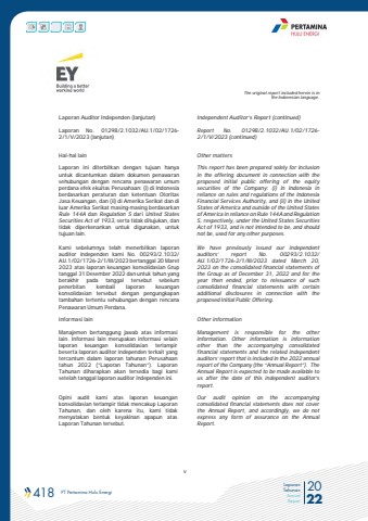 418 PT Pertamina Hulu Energi 2022Laporan TahunanAnnual ReportvThe original report included herein is inthe Indonesian language.Laporan Auditor Independen (lanjutan)Laporan No. 01298/2.1032/AU.1/02/1726-2/1/V/2023 (lanjutan)Independent Auditor%u2019s Report (continued)Report No. 01298/2.1032/AU.1/02/1726-2/1/V/2023 (continued)Hal-hal lain Other mattersLaporan ini diterbitkan dengan tujuan hanyauntuk dicantumkan dalam dokumen penawaransehubungan dengan rencana penawaran umumperdana efek ekuitas Perusahaan: (i) di Indonesiaberdasarkan peraturan dan ketentuan OtoritasJasa Keuangan, dan (ii) di Amerika Serikat dan diluar Amerika Serikat masing-masing berdasarkanRule 144A dan Regulation S dari United StatesSecurities Act of 1933, serta tidak ditujukan, dantidak diperkenankan untuk digunakan, untuktujuan lain.This report has been prepared solely for inclusionin the offering document in connection with theproposed initial public offering of the equitysecurities of the Company: (i) in Indonesia inreliance on rules and regulations of the IndonesiaFinancial Services Authority, and (ii) in the UnitedStates of America and outside of the United Statesof America in reliance on Rule 144A and RegulationS, respectively, under the United States SecuritiesAct of 1933, and is not intended to be, and shouldnot be, used for any other purposes.Kami sebelumnya telah menerbitkan laporanauditor independen kami No. 00293/2.1032/AU.1/02/1726-2/1/III/2023 bertanggal 20 Maret2023 atas laporan keuangan konsolidasian Gruptanggal 31 Desember 2022 dan untuk tahun yangberakhir pada tanggal tersebut sebelumpenerbitan kembali laporan keuangankonsolidasian tersebut dengan pengungkapantambahan tertentu sehubungan dengan rencanaPenawaran Umum Perdana.We have previously issued our independentauditors%u2019 report No. 00293/2.1032/AU.1/02/1726-2/1/III/2023 dated March 20,2023 on the consolidated financial statements ofthe Group as of December 31, 2022 and for theyear then ended, prior to reissuance of suchconsolidated financial statements with certainadditional disclosures in connection with theproposed Initial Public Offering.Informasi lain Other informationManajemen bertanggung jawab atas informasilain. Informasi lain merupakan informasi selainlaporan keuangan konsolidasian terlampirbeserta laporan auditor independen terkait yangtercantum dalam laporan tahunan Perusahaantahun 2022 (%u201cLaporan Tahunan%u201d). LaporanTahunan diharapkan akan tersedia bagi kamisetelah tanggal laporan auditor independen ini.Management is responsible for the otherinformation. Other information is informationother than the accompanying consolidatedfinancial statements and the related independentauditors%u2019 report that is included in the 2022 annualreport of the Company (the %u201cAnnual Report%u201d). TheAnnual Report is expected to be made available tous after the date of this independent auditor%u2019sreport.Opini audit kami atas laporan keuangankonsolidasian terlampir tidak mencakup LaporanTahunan, dan oleh karena itu, kami tidakmenyatakan bentuk keyakinan apapun atasLaporan Tahunan tersebut.Our audit opinion on the accompanyingconsolidated financial statements does not coverthe Annual Report, and accordingly, we do notexpress any form of assurance on the AnnualReport.