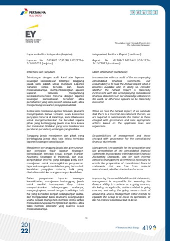 PT Pertamina Hulu Energi 419 2022viThe original report included herein is inthe Indonesian language.Laporan Auditor Independen (lanjutan)Laporan No. 01298/2.1032/AU.1/02/1726-2/1/V/2023 (lanjutan)Independent Auditor%u2019s Report (continued)Report No. 01298/2.1032/AU.1/02/1726-2/1/V/2023 (continued)Informasi lain (lanjutan) Other information (continued)Sehubungan dengan audit kami atas laporankeuangan konsolidasian terlampir, tanggungjawab kami adalah untuk membaca LaporanTahunan ketika tersedia dan, dalammelaksanakannya, mempertimbangkan apakahLaporan Tahunan mengandungketidakkonsistensian material dengan laporankeuangan konsolidasian terlampir ataupemahaman yang kami peroleh selama audit, ataumengandung kesalahan penyajian material.In connection with our audit of the accompanyingconsolidated financial statements, ourresponsibility is to read the Annual Report when itbecomes available and, in doing so, considerwhether the Annual Report is materiallyinconsistent with the accompanying consolidatedfinancial statements or our knowledge obtained inthe audit, or otherwise appears to be materiallymisstated.Ketika kami membaca Laporan Tahunan, jika kamimenyimpulkan bahwa terdapat suatu kesalahanpenyajian material di dalamnya, kami diharuskanuntuk mengomunikasikan hal tersebut kepadapihak yang bertanggung jawab atas tata keloladan melakukan tindakan yang tepat berdasarkanperaturan perundang-undangan yang berlaku.When we read the Annual Report, if we concludethat there is a material misstatement therein, weare required to communicate the matter to thosecharged with governance and take appropriateactions based on the applicable laws andregulations.Tanggung jawab manajemen dan pihak yangbertanggung jawab atas tata kelola terhadaplaporan keuangan konsolidasianResponsibilities of management and thosecharged with governance for the consolidatedfinancial statementsManajemen bertanggung jawab atas penyusunandan penyajian wajar laporan keuangankonsolidasian tersebut sesuai dengan StandarAkuntansi Keuangan di Indonesia, dan ataspengendalian internal yang dianggap perlu olehmanajemen untuk memungkinkan penyusunanlaporan keuangan konsolidasian yang bebas darikesalahan penyajian material, baik yangdisebabkan oleh kecurangan maupun kesalahan.Management is responsible for the preparation andfair presentation of the consolidated financialstatements in accordance with Indonesian FinancialAccounting Standards, and for such internalcontrol as management determines is necessary toenable the preparation of consolidated financialstatements that are free from materialmisstatement, whether due to fraud or error.Dalam penyusunan laporan keuangankonsolidasian, manajemen bertanggung jawabuntuk menilai kemampuan Grup dalammempertahankan kelangsungan usahanya,mengungkapkan, sesuai dengan kondisinya, halhal yang berkaitan dengan kelangsungan usaha,dan menggunakan basis akuntansi kelangsunganusaha, kecuali manajemen memiliki intensi untukmelikuidasi Grup atau menghentikan operasi, atautidak memiliki alternatif yang realistis selainmelaksanakannya.In preparing the consolidated financial statements,management is responsible for assessing theGroup%u2019s ability to continue as a going concern,disclosing, as applicable, matters related to goingconcern, and using the going concern basis ofaccounting, unless management either intends toliquidate the Group or to cease its operations, orhas no realistic alternative but to do so.
