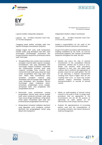 PT Pertamina Hulu Energi 421 2022viiiThe original report included herein is inthe Indonesian language.Laporan Auditor Independen (lanjutan)Laporan No. 01298/2.1032/AU.1/02/1726-2/1/V/2023 (lanjutan)Independent Auditor%u2019s Report (continued)Report No. 01298/2.1032/AU.1/02/1726-2/1/V/2023 (continued)Tanggung jawab auditor terhadap audit ataslaporan keuangan konsolidasian (lanjutan)Auditor%u2019s responsibilities for the audit of theconsolidated financial statements (continued)Sebagai bagian dari suatu audit berdasarkanStandar Audit yang ditetapkan oleh IAPI, kamimenerapkan pertimbangan profesional danmempertahankan skeptisisme profesional selamaaudit. Kami juga:As part of an audit in accordance with Standards onAuditing established by the IICPA, we exerciseprofessional judgment and maintain professionalskepticism throughout the audit. We also:%uf0b7 Mengidentifikasi dan menilai risiko kesalahanpenyajian material dalam laporan keuangankonsolidasian, baik yang disebabkan olehkecurangan maupun kesalahan, mendesaindan melaksanakan prosedur audit yangresponsif terhadap risiko tersebut, sertamemeroleh bukti audit yang cukup dan tepatuntuk menyediakan basis bagi opini auditkami. Risiko tidak terdeteksinya suatukesalahan penyajian material yangdisebabkan oleh kecurangan lebih tinggi dariyang disebabkan oleh kesalahan, karenakecurangan dapat melibatkan kolusi,pemalsuan, penghilangan secara sengaja,pernyataan salah, atau pengabaian ataspengendalian internal.%uf0b7 Identify and assess the risks of materialmisstatement of the consolidated financialstatements, whether due to fraud or error,design and perform audit proceduresresponsive to such risks, and obtain auditevidence that is sufficient and appropriate toprovide a basis for our audit opinion. The riskof not detecting a material misstatementresulting from fraud is higher than for oneresulting from error, as fraud may involvecollusion, forgery, intentional omissions,misrepresentations, or override of internalcontrol.%uf0b7 Memeroleh suatu pemahaman tentangpengendalian internal yang relevan denganaudit untuk mendesain prosedur audit yangtepat sesuai dengan kondisinya, tetapi bukanuntuk tujuan menyatakan opini audit ataskeefektivitasan pengendalian internal Grup.%uf0b7 Obtain an understanding of internal controlrelevant to the audit in order to design auditprocedures that are appropriate in thecircumstances, but not for the purpose ofexpressing an audit opinion on theeffectiveness of the Group%u2019s internal control.%uf0b7 Mengevaluasi ketepatan kebijakan akuntansiyang digunakan serta kewajaran estimasiakuntansi dan pengungkapan terkait yangdibuat oleh manajemen.%uf0b7 Evaluate the appropriateness of accountingpolicies used and the reasonableness ofaccounting estimates and related disclosuresmade by management.