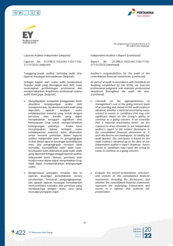 422 PT Pertamina Hulu Energi 2022Laporan TahunanAnnual ReportixThe original report included herein is inthe Indonesian language.Laporan Auditor Independen (lanjutan)Laporan No. 01298/2.1032/AU.1/02/1726-2/1/V/2023 (lanjutan)Independent Auditor%u2019s Report (continued)Report No. 01298/2.1032/AU.1/02/1726-2/1/V/2023 (continued)Tanggung jawab auditor terhadap audit ataslaporan keuangan konsolidasian (lanjutan)Auditor%u2019s responsibilities for the audit of theconsolidated financial statements (continued)Sebagai bagian dari suatu audit berdasarkanStandar Audit yang ditetapkan oleh IAPI, kamimenerapkan pertimbangan profesional danmempertahankan skeptisisme profesional selamaaudit. Kami juga: (lanjutan)As part of an audit in accordance with Standards onAuditing established by the IICPA, we exerciseprofessional judgment and maintain professionalskepticism throughout the audit. We also:(continued)%uf0b7 Menyimpulkan ketepatan penggunaan basisakuntansi kelangsungan usaha olehmanajemen dan, berdasarkan bukti audit yangdiperoleh, apakah terdapat suatuketidakpastian material yang terkait denganperistiwa atau kondisi yang dapatmenyebabkan keraguan signifikan ataskemampuan Grup untuk mempertahankankelangsungan usahanya. Ketika kamimenyimpulkan bahwa terdapat suatuketidakpastian material, kami diharuskanuntuk menarik perhatian dalam laporanauditor independen kami ke pengungkapanterkait dalam laporan keuangan konsolidasianatau, jika pengungkapan tersebut tidakmemadai, memodifikasi opini audit kami.Kesimpulan kami didasarkan pada bukti audityang diperoleh hingga tanggal laporan auditorindependen kami. Namun, peristiwa ataukondisi masa depan dapat menyebabkan Gruptidak dapat mempertahankan kelangsunganusaha.%uf0b7 Conclude on the appropriateness ofmanagement's use of the going concern basisof accounting and, based on the audit evidenceobtained, whether a material uncertainty existsrelated to events or conditions that may castsignificant doubt on the Group's ability tocontinue as a going concern. If we concludethat a material uncertainty exists, we arerequired to draw attention in our independentauditor%u2019s report to the related disclosures inthe consolidated financial statements or, ifsuch disclosures are inadequate, to modify ouraudit opinion. Our conclusion is based on theaudit evidence obtained up to the date of ourindependent auditor%u2019s report. However, futureevents or conditions may cause the Group tocease to continue as a going concern.%uf0b7 Mengevaluasi penyajian, struktur, dan isilaporan keuangan konsolidasian secarakeseluruhan, termasuk pengungkapannya,dan apakah laporan keuangan konsolidasianmencerminkan transaksi dan peristiwa yangmendasarinya dengan suatu cara yangmencapai penyajian wajar.%uf0b7 Evaluate the overall presentation, structure,and content of the consolidated financialstatements, including the disclosures, andwhether the consolidated financial statementsrepresent the underlying transactions andevents in a manner that achieves fairpresentation.