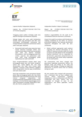 PT Pertamina Hulu Energi 423 2022xThe original report included herein is inthe Indonesian language.Laporan Auditor Independen (lanjutan)Laporan No. 01298/2.1032/AU.1/02/1726-2/1/V/2023 (lanjutan)Independent Auditor%u2019s Report (continued)Report No. 01298/2.1032/AU.1/02/1726-2/1/V/2023 (continued)Tanggung jawab auditor terhadap audit ataslaporan keuangan konsolidasian (lanjutan)Auditor%u2019s responsibilities for the audit of theconsolidated financial statements (continued)Sebagai bagian dari suatu audit berdasarkanStandar Audit yang ditetapkan oleh IAPI, kamimenerapkan pertimbangan profesional danmempertahankan skeptisisme profesional selamaaudit. Kami juga: (lanjutan)As part of an audit in accordance with Standards onAuditing established by the IICPA, we exerciseprofessional judgment and maintain professionalskepticism throughout the audit. We also:(continued)%uf0b7 Memeroleh bukti audit yang cukup dan tepatterkait informasi keuangan entitas atauaktivitas bisnis dalam Grup untuk menyatakanopini audit atas laporan keuangankonsolidasian. Kami bertanggung jawab atasarahan, supervisi, dan pelaksanaan auditgrup. Kami tetap bertanggung jawabsepenuhnya atas opini audit kami.%uf0b7 Obtain sufficient appropriate audit evidenceregarding the financial information of theentities or business activities within the Groupto express an audit opinion on the consolidatedfinancial statements. We are responsible forthe direction, supervision, and performance ofthe group audit. We remain solely responsiblefor our audit opinion.Kami mengomunikasikan kepada pihak yangbertanggung jawab atas tata kelola mengenai,antara lain, ruang lingkup dan saat yangdirencanakan atas audit serta temuan auditsignifikan, termasuk setiap defisiensi signifikandalam pengendalian internal yang teridentifikasioleh kami selama audit.We communicate with those charged withgovernance regarding, among other matters, theplanned scope and timing of the audit andsignificant audit findings, including any significantdeficiencies in internal control that we identifyduring our audit.Kami juga memberikan suatu pernyataan kepadapihak yang bertanggung jawab atas tata kelolabahwa kami telah mematuhi ketentuan etika yangrelevan mengenai independensi, danmengomunikasikan kepada pihak tersebut seluruhhubungan, serta hal-hal lain yang dianggap secarawajar berpengaruh terhadap independensi kami,dan, jika relevan, pengamanan terkait.We also provide those charged with governancewith a statement that we have complied withrelevant ethical requirements regardingindependence, and to communicate with them allrelationships and other matters that mayreasonably be thought to bear on ourindependence, and where applicable, relatedsafeguards.
