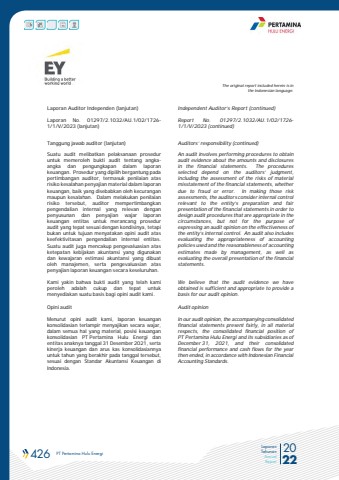 426 PT Pertamina Hulu Energi 2022Laporan TahunanAnnual ReportThe original report included herein is inthe Indonesian language.Laporan Auditor Independen (lanjutan)Laporan No. 01297/2.1032/AU.1/02/1726-1/1/V/2023 (lanjutan)Independent Auditor%u2019s Report (continued)Report No. 01297/2.1032/AU.1/02/1726-1/1/V/2023 (continued)Tanggung jawab auditor (lanjutan) Auditors%u2019 responsibility (continued)Suatu audit melibatkan pelaksanaan proseduruntuk memeroleh bukti audit tentang angkaangka dan pengungkapan dalam laporankeuangan. Prosedur yang dipilih bergantung padapertimbangan auditor, termasuk penilaian atasrisiko kesalahan penyajian material dalam laporankeuangan, baik yang disebabkan oleh kecuranganmaupun kesalahan. Dalam melakukan penilaianrisiko tersebut, auditor mempertimbangkanpengendalian internal yang relevan denganpenyusunan dan penyajian wajar laporankeuangan entitas untuk merancang proseduraudit yang tepat sesuai dengan kondisinya, tetapibukan untuk tujuan menyatakan opini audit ataskeefektivitasan pengendalian internal entitas.Suatu audit juga mencakup pengevaluasian atasketepatan kebijakan akuntansi yang digunakandan kewajaran estimasi akuntansi yang dibuatoleh manajemen, serta pengevaluasian ataspenyajian laporan keuangan secara keseluruhan.An audit involves performing procedures to obtainaudit evidence about the amounts and disclosuresin the financial statements. The proceduresselected depend on the auditors%u2019 judgment,including the assessment of the risks of materialmisstatement of the financial statements, whetherdue to fraud or error. In making those riskassessments, the auditors consider internal controlrelevant to the entity%u2019s preparation and fairpresentation of the financial statements in order todesign audit procedures that are appropriate in thecircumstances, but not for the purpose ofexpressing an audit opinion on the effectiveness ofthe entity%u2019s internal control. An audit also includesevaluating the appropriateness of accountingpolicies used and the reasonableness of accountingestimates made by management, as well asevaluating the overall presentation of the financialstatements.Kami yakin bahwa bukti audit yang telah kamiperoleh adalah cukup dan tepat untukmenyediakan suatu basis bagi opini audit kami.We believe that the audit evidence we haveobtained is sufficient and appropriate to provide abasis for our audit opinion.Opini audit Audit opinionMenurut opini audit kami, laporan keuangankonsolidasian terlampir menyajikan secara wajar,dalam semua hal yang material, posisi keuangankonsolidasian PT Pertamina Hulu Energi danentitas anaknya tanggal 31 Desember 2021, sertakinerja keuangan dan arus kas konsolidasiannyauntuk tahun yang berakhir pada tanggal tersebut,sesuai dengan Standar Akuntansi Keuangan diIndonesia.In our audit opinion, the accompanying consolidatedfinancial statements present fairly, in all materialrespects, the consolidated financial position ofPT Pertamina Hulu Energi and its subsidiaries as ofDecember 31, 2021, and their consolidatedfinancial performance and cash flows for the yearthen ended, in accordance with Indonesian FinancialAccounting Standards.