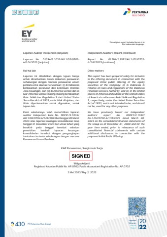 The original report included herein is inthe Indonesian language.Laporan Auditor Independen (lanjutan)Laporan No. 01296/2.1032/AU.1/02/0702-6/1/V/2023 (lanjutan)Independent Auditor%u2019s Report (continued)Report No. 01296/2.1032/AU.1/02/0702-6/1/V/2023 (continued)Hal-hal lain Other mattersLaporan ini diterbitkan dengan tujuan hanyauntuk dicantumkan dalam dokumen penawaransehubungan dengan rencana penawaran umumperdana efek ekuitas Perusahaan: (i) di Indonesiaberdasarkan peraturan dan ketentuan OtoritasJasa Keuangan, dan (ii) di Amerika Serikat dan diluar Amerika Serikat masing-masing berdasarkanRule 144A dan Regulation S dari United StatesSecurities Act of 1933, serta tidak ditujukan, dantidak diperkenankan untuk digunakan, untuktujuan lain.This report has been prepared solely for inclusionin the offering document in connection with theproposed initial public offering of the equitysecurities of the Company: (i) in Indonesia inreliance on rules and regulations of the IndonesiaFinancial Services Authority, and (ii) in the UnitedStates of America and outside of the United Statesof America in reliance on Rule 144A and RegulationS, respectively, under the United States SecuritiesAct of 1933, and is not intended to be, and shouldnot be, used for any other purposes.Kami sebelumnya telah menerbitkan laporanauditor independen kami No. 00291/2.1032/AU.1/02/0702-6/1/III/2023 bertanggal 20 Maret2023 atas laporan keuangan konsolidasian Gruptanggal 31 Desember 2020 dan untuk tahun yangberakhir pada tanggal tersebut sebelumpenerbitan kembali laporan keuangankonsolidasian tersebut dengan pengungkapantambahan tertentu sehubungan dengan rencanaPenawaran Umum Perdana.We have previously issued our independentauditors%u2019 report No. 00291/2.1032/AU.1/02/0702-6/1/III/2023 dated March 20,2023 on the consolidated financial statements ofthe Group as of December 31, 2020 and for theyear then ended, prior to reissuance of suchconsolidated financial statements with certainadditional disclosures in connection with theproposed Initial Public Offering.KAP Purwantono, Sungkoro & SurjaWidya ArijantiRegistrasi Akuntan Publik No. AP.0702/Public Accountant Registration No. AP.07022 Mei 2023/May 2, 2023430 PT Pertamina Hulu Energi 2022Laporan TahunanAnnual Report