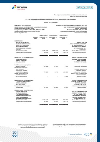 PT Pertamina Hulu Energi 435 2022The original consolidated financial statements included herein are in the Indonesian language.PT PERTAMINA HULU ENERGI TBK DAN ENTITAS ANAK/AND SUBSIDIARIES Daftar 2/2 Schedule Catatan atas laporan keuangan konsolidasian terlampir merupakan bagian yang tidak terpisahkan dari laporan keuangan konsolidasian secara keseluruhan.The accompanying notes to the consolidated financial statements form an integral part of these consolidated financial statements. LAPORAN LABA RUGI DAN CONSOLIDATED STATEMENTS OF PROFIT OR LOSSPENGHASILAN KOMPREHENSIF LAIN KONSOLIDASIAN AND OTHER COMPREHENSIVE INCOMEUntuk Tahun yang Berakhir pada For The Years Ended Tanggal-Tanggal 31 Desember 2022, 2021, dan 2020 December 31, 2022, 2021, and 2020(Disajikan dalam ribuan Dollar Amerika Serikat, (Expressed in thousands of United States dollars, kecuali dinyatakan lain) unless otherwise stated) 31 Desember/ 31 Desember/ 31 Desember/ Catatan/ December 31, December 31, December 31, Notes 2022 2021 2020 LABA TAHUNBERJALAN SETELAH PROFIT FOR THE DAMPAK PENYESUAIAN YEAR AFTER THE EFFECTLABA ENTITAS YANG OF MERGING ENTITY%u2019SBERGABUNG YANG INCOME ADJUSTMENTDIATRIBUSIKAN KEPADA: ATTRIBUTABLE TO:(lanjutan) (continued)Pemilik entitas induk 4.580.379 2.899.870 538.556 Owner of the parent entityKepentingan non-pengendali 93.785 52.770 (154.519) Non-controlling interests 4.674.164 2.952.640 384.037 PENGHASILAN KOMPREHENSIF OTHER COMPREHENSIVELAIN YANG AKAN INCOME THAT WILL BEDIREKLASIFIKASI RECLASSIFIEDKE LABA RUGI TO PROFIT OR LOSSSelisih kurs karena penjabaran laporan keuangan (24.908) (1.302) 1.554 Translation adjustmentsPenyesuaian nilai wajar atas instrumen Fair value adjustment onlindung nilai arus kas cash flow hedgingsetelah dikurangi pajak 77.882 8.414 (47.882) instruments - net of taxBagian rugi komprehensif Share of other comprehensivelain entitas asosiasi loss of associatesdan ventura bersama - - 5.184 and joint venturePENGHASILAN KOMPREHENSIF OTHER COMPREHENSIVELAIN YANG TIDAK AKAN INCOME THAT WILL NOTDIREKLASIFIKASI BE RECLASSIFIEDKE LABA RUGI TO PROFIT OR LOSSPengukuran kembali program Remeasurement of definedimbalan kerja 31.024 25.465 10.446 benefit program JUMLAH LABA KOMPREHENSIFTAHUN BERJALAN TOTAL COMPREHENSIVESETELAH DAMPAK INCOME FOR THE YEARPENYESUAIAN LABA AFTER THE EFFECTKOMPREHENSIF ENTITAS OF MERGING ENTITY%u2019SYANG BERGABUNG INCOME ADJUSTMENTDIATRIBUSIKAN KEPADA: ATTRIBUTABLE TO:Pemilik entitas induk 4.666.517 2.933.327 507.858 Owner of the parent entityKepentingan non-pengendali 91.645 51.890 (154.519) Non-controlling interests 4.758.162 2.985.217 353.339