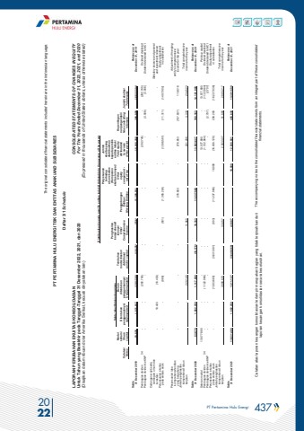 PT Pertamina Hulu Energi 437 2022The original consolidated financial statements included herein are in the Indonesian language.PT PERTAMINA HULU ENERGI TBK DAN ENTITAS ANAK/AND SUBSIDIARIES Daftar 3/1 ScheduleCatatan atas laporan keuangan konsolidasian terlampir merupakan bagian yang tidak terpisahkan dari laporan keuangan konsolidasian secara keseluruhan.The accompanying notes to the consolidated financial statements form an integral part of these consolidated financial statements.LAPORAN PERUBAHAN EKUITAS KONSOLIDASIAN Untuk Tahun yang Berakhir pada Tanggal-Tanggal 31 Desember 2022, 2021, dan 2020(Disajikan dalam ribuan dolar Amerika Serikat, kecuali dinyatakan lain)CONSOLIDATED STATEMENTS OF CHANGES IN EQUITY For The Years Ended December 31, 2022, 2021, and 2020 (Expressed in thousands of United States dollars, unless otherwise stated)Diatribusikan kepada pemilik entitas induk/Attributable to the owners of the parent Penyesuaian Jumlahterhadap ekuitas yangakun ekuitas diatribusikan Penghasilan (Komponen kepada pemilikSaldo laba/Retained earnings komprehensif ekuitas lainnya)/ entitas induk/Modal Belum Tambahan lainnya/ Other Total equity Kepentingan saham/ Ditentukan ditentukan modal disetor/ Other Penggabungan equity attributable nonpengendali/ Catatan/ Share penggunaannya/ penggunaannya/ Additional Comprehensive Entitas/ component - to owners Non-controlling Jumlah ekuitas/Notes capital Appropriated Unappropriated paid in capital Income Merging Entities net of tax of the parent interests Total equitySaldo Balance as at31 Desember 2019 53.576 1.571.817 1.201.785 (18.178) (226) 12.356.531 - 15.165.305 366.999 15.532.304 December 31, 2019 Pembagian dividen 34 - - (292.745) - - - - (292.745) - (292.745) Dividend declaredPembagian dividen ke KNP - - - - - - - - (3.006) (3.006) Dividend declared to NCICadangan wajib serta cadangan umum dan Statutory reserve and general investasi - 10.433 (10.433) - - - - - - - and investment reserve Penyesuaian ekuitas Equity adjustment pada entitas anak - - (866) - (501) (1.395.224) - (1.396.591) (11.311) (1.407.902) in subsidiariesPenyesuaian laba Adjustment of mergingkomprehensif entitas entity%u2019s comprehensiveyang bergabung - - - - - 276.653 - 276.653 (157.837) 118.816 income for the yearJumlah penghasilan komprehensif tahun Total comprehensive berjalan - - 220.145 - 11.060 - - 231.205 3.318 234.523 income for the yearSaldo Balance as at31 Desember 2020 53.576 1.582.250 1.117.886 (18.178) 10.333 11.237.960 - 13.983.827 198.163 14.181.990 December 31, 2020Setoran modal 13.577.890 - - - - - - 13.577.890 - 13.577.890 Paid-up capitalPembagian dividen 34 - - (1.122.964) - - - - (1.122.964) - (1.122.964) Dividend declaredPembagian dividen ke KNP - - - - - - - - (2.707) (2.707) Dividend declared to NCIPenyesuaian ekuitas Equity adjustment pada entitas anak - - (1.583.665) (3.631.691) (903) (11.237.960) 18.090 (16.436.129) 208.293 (16.227.836) in subsidiaries Jumlah penghasilan komprehensif tahun Total comprehensive berjalan - - 2.899.870 - 33.457 - - 2.933.327 51.890 2.985.217 income for the yearSaldo Balance as at31 Desember 2021 13.631.466 1.582.250 1.311.127 (3.649.869) 42.887 - 18.090 12.935.951 455.639 13.391.590 December 31, 2021