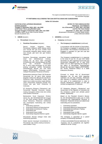 PT Pertamina Hulu Energi 441 2022The original consolidated financial statements included herein are in the Indonesian language.PT PERTAMINA HULU ENERGI TBK DAN ENTITAS ANAK/AND SUBSIDIARIES Daftar 5/2 ScheduleCATATAN ATAS LAPORAN KEUANGANKONSOLIDASIANTanggal 31 Desember 2022, 2021, dan 2020serta Untuk Tahun yang Berakhir pada Tanggal-Tanggal 31 Desember 2020, 2021, dan 2020(Disajikan dalam ribuan dolar Amerika Serikat, kecuali dinyatakan lain)NOTES TO THE CONSOLIDATEDFINANCIAL STATEMENTSAs of December 31, 2022, 2021, and 2020and For The Years Ended December 31, 2022, 2021, and 2020(Expressed in thousands of United States dollars,unless otherwise stated)1. UMUM (lanjutan) 1. GENERAL (continued)a. Perusahaan (lanjutan) a. Company (continued)i. Pendirian Perusahaan (lanjutan) i. The Company%u2019s establishment (continued)Sesuai dengan Anggaran Dasar, Perusahaan bergerak dalam bidang usaha hulu minyak dan gas bumi. Entitas Anak Perusahaan bergerak dalam bidang usaha hulu minyak, gas bumi dan gas metana batubara.In accordance with the Articles of Association, the Company is engaged in upstream oil and gas activities. The Company%u2019s Subsidiaries are engaged in upstream oil, gas and coal bed methane activities.Pendirian Perusahaan merupakan tindak lanjut dari diterbitkannya UndangUndang No. 22 tahun 2001 tertanggal 23 November 2001 tentang Minyak dan Gas Bumi dan Peraturan Pemerintah No. 31 tahun 2003 tertanggal 18 Juni 2003 tentang pengalihan bentuk Perusahaan Pertambangan Minyak dan Gas Bumi Negara (PERTAMINA, %u201cPertamina Lama%u201d) menjadi Perusahaan Perseroan (Persero). The Company%u2019s establishment is in response to the issue of Law No. 22 year 2001 dated November 23, 2001 regarding Oil and Gas and Government Regulation No. 31 year 2003 dated June 18, 2003 regarding the change in the status of Perusahaan Pertambangan Minyak dan Gas Bumi Negara (PERTAMINA, the %u201cformer Pertamina Entity%u201d) to a State Enterprise (Persero). Berdasarkan ketentuan Pasal 104 Peraturan Pemerintah No. 35 tahun 2004 tentang Kegiatan Usaha Hulu Minyak dan Gas Bumi, Pertamina wajib membentuk entitas anak dalam kurun waktu dua tahun sejak didirikan untuk meneruskan perjanjian kontrak hulu minyak dan gas bumi Pertamina di Indonesia.Pursuant to Article 104 of Government Regulation No. 35 year 2004 regarding Upstream Oil and Gas Activities, Pertamina was required to establish subsidiaries within two years of its establishment in order to assume Pertamina%u2019s upstream oil and gas contract arrangements in Indonesia. PT Pertamina (Persero) (%u201cPertamina%u201d) dan Pemerintah Republik Indonesia masingmasing merupakan entitas induk dan entitas induk terakhir Perseroan.PT Pertamina (Persero) (%u201cPertamina%u201d) and Government of the Republic of Indonesia are the Company%u2019s parent and ultimate parent entities, respectively.Berdasarkan Surat Keputusan Direktur Utama No. SK-18/C00000/2020-S0 tanggal 12 Juni 2020 tentang Struktur Organisasi Dasar Pertamina, Pertamina membentuk dan menetapkan Subholding dan entitas anaknya: 1. Subholding Upstream2. Subholding Refining & Petrochemical3. Subholding Commercial & Trading4. Subholding Gas5. Subholding Power & NRE6. Subholding Integrated Marine LogisticPerusahaan ditunjuk sebagai induk atas Subholding Upstream. Based on the President Director's Decree No. SK-18/C00000/2020-S date June 12, 2020 concerning the Organizational Structure of Pertamina, Pertamina formed and determined Subholding and its subsidiaries:1. Subholding Upstream2. Subholding Refining & Petrochemical3. Subholding Commercial & Trading4. Subholding Gas5. Subholding Power & NRE6. Subholding Integrated Marine Logistic The Company is appointed as a parent company of Subholding Upstream.Dalam laporan keuangan konsolidasian ini, Perusahaan dan entitas anaknya bersama - sama disebut %u201cGrup%u201d.In these consolidated financial statements, the Company and its subsidaries are together reffered to as the %u201cGroup%u201d.