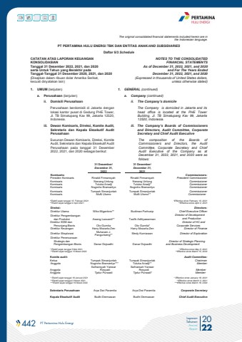 442 PT Pertamina Hulu Energi 2022Laporan TahunanAnnual ReportThe original consolidated financial statements included herein are in the Indonesian language.PT PERTAMINA HULU ENERGI TBK DAN ENTITAS ANAK/AND SUBSIDIARIES Daftar 5/3 ScheduleCATATAN ATAS LAPORAN KEUANGANKONSOLIDASIANTanggal 31 Desember 2022, 2021, dan 2020serta Untuk Tahun yang Berakhir pada Tanggal-Tanggal 31 Desember 2020, 2021, dan 2020(Disajikan dalam ribuan dolar Amerika Serikat, kecuali dinyatakan lain)NOTES TO THE CONSOLIDATEDFINANCIAL STATEMENTSAs of December 31, 2022, 2021, and 2020and For The Years Ended December 31, 2022, 2021, and 2020(Expressed in thousands of United States dollars,unless otherwise stated)1. UMUM (lanjutan) 1. GENERAL (continued)a. Perusahaan (lanjutan) a. Company (continued)ii. Domisili Perusahaan ii. The Company%u2019s domicilePerusahaan berdomisili di Jakarta dengan lokasi kantor pusat di Gedung PHE Tower, Jl. TB Simatupang Kav 99, Jakarta 12520, Indonesia. The Company is domiciled in Jakarta and its head office is located at the PHE Tower Building, Jl. TB Simatupang Kav 99, Jakarta 12520, Indonesia. iii. Dewan Komisaris, Direksi, Komite Audit, Sekretaris dan Kepala Eksekutif Audit Perusahaaniii. The Company%u2019s Boards of Commissioners and Directors, Audit Committee, Corporate Secretary and Chief Audit ExecutiveSusunan Dewan Komisaris, Direksi, Komite Audit, Sekretaris dan Kepala Eksekutif Audit Perusahaan pada tanggal 31 Desember 2022, 2021, dan 2020 sebagai berikut:The composition of the Boards of Commissioners and Directors, the AuditCommittee, Corporate Secretary and Chief Audit Executive of the Company as at December 31, 2022, 2021, and 2020 were as follows:31 Desember/ 31 Desember/December 31, December 31,2022 2021Komisaris: Commissioners:Presiden Komisaris Rinaldi Firmansyah Rinaldi Firmansyah President CommissionerKomisaris Nanang Untung Nanang Untung CommissionerKomisaris Tutuka Ariadji Tutuka Ariadji* CommissionerKomisaris Nugroho Bramantyo Nugroho Bramantyo CommissionerKomisaris Tumpak Simanjuntak Tumpak Simanjuntak CommissionerKomisaris Mufti Utomo Mufti Utomo** Commissioner*Efektif sejak tanggal 15 Februari 2021**Efektif sejak tanggal 2 April 2021 *Effective since February 15, 2021 **Effective since April 2, 2021Direksi: Directors:Direktur Utama Wiko Migantoro** Budiman Parhusip Chief Executive OfficerDirektur Pengembangan dan Produksi Awang Lazuardi** Taufik AditiyawarmanDirector of Development and ProductionDirektur SDM dan Penunjang Bisnis Oto Gurnita Oto Gurnita* Director of HC and Corporate ServicesDirektur Keuangan Harry Mozarta Zen Harry Mozarta Zen Director of FinanceDirektur Eksplorasi Muharam J. Panguriseng** Medy Kurniawan Director of ExplorationDirektur Perencanaan Strategis dan Pengembangan Bisnis Danar Dojoadhi Danar Dojoadhi Director of Strategic Planning and Business Development* Efektif sejak tanggal 5 Mei 2021 * Effective since May 5, 2021**Efektif sejak tanggal 15 Maret 2022 **Effective since March 15, 2022Komite audit: Audit Committee:Ketua Tumpak Simanjuntak Tumpak Simanjuntak ChairmanAnggota Nugroho Bramantyo*** Tutuka Ariadji** MemberAnggotaSafriansyah Yanwar RosyadiSafriansah Yanwar Rosyadi MemberAnggota Tjatur Purwadi Tjatur Purwadi* Member* Efektif sejak tanggal 18 Januari 2021 * Effective since January 18, 2021**Efektif sejak tanggal 3 Maret 2021 **Effective since March 3, 2021***Efektif sejak tanggal 18 Maret 2022 ***Effective since March 18, 2022Sekretaris Perusahaan Arya Dwi Paramita Arya Dwi Paramita Corporate SecretaryKepala Eksekutif Audit Budhi Dermawan Budhi Dermawan Chief Audit Executive