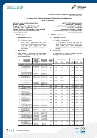 444 PT Pertamina Hulu Energi 2022Laporan TahunanAnnual ReportThe original consolidated financial statements included herein are in the Indonesian language.PT PERTAMINA HULU ENERGI TBK DAN ENTITAS ANAK/AND SUBSIDIARIES Daftar 5/5 ScheduleCATATAN ATAS LAPORAN KEUANGANKONSOLIDASIANTanggal 31 Desember 2022, 2021, dan 2020serta Untuk Tahun yang Berakhir pada Tanggal-Tanggal 31 Desember 2020, 2021, dan 2020(Disajikan dalam ribuan dolar Amerika Serikat, kecuali dinyatakan lain)NOTES TO THE CONSOLIDATEDFINANCIAL STATEMENTSAs of December 31, 2022, 2021, and 2020and For The Years Ended December 31, 2022, 2021, and 2020(Expressed in thousands of United States dollars,unless otherwise stated)1. UMUM (lanjutan) 1. GENERAL (continued)a. Perusahaan (lanjutan) a. Company (continued)iv. Jumlah karyawan iv. Number of employeesPada tanggal 31 Desember 2022 Grup mempunyai 12.832 karyawan (31 Desember 2021 dan 2020: 12.915 dan 12.652karyawan). Informasi jumlah karyawan ini tidak diaudit.As at December 31, 2022, the Group has 12,832 employees (December 31, 2021 and2020: 12,915 and 12,652 employees). Information on the number of employees is not audited.b. Entitas Anak b. SubsidiariesPada tanggal 31 Desember 2022 Perusahaan memiliki pengendalian langsung pada entitas anak sebagai berikut: As of December 31, 2022, the Company controlled directly the following subsidiaries:No.Nama Entitas Anakdan Wilayah Kerja/Name of Subsidiariesand Working AreaTanggal perolehanIzin eksplorasi/ eksploitasi/Date of exploration/exploitation permitobtainedMulai beroperasi secara komersial/Start of commercial operationsTempat kedudukan/Place ofdomicilePersentase Kepemilikan/Percentage of OwnershipJumlah aset sebelum eliminasi/Total assets before elimination31 Des/Dec 202231 Des/Dec 202131 Des/Dec 202031 Des/Dec 202231 Des/Dec 202131 Des/Dec 2020Eksplorasi untuk dan produksi minyak dan gas bumi/ Exploration for and production of oil and gas1. PT Pertamina Hulu Energi ONWJ (%u201cPHE ONWJ%u201d) - Blok ONWJ/ ONWJ Block18 Januari 2017/January 18, 2017 11 Desember 2009/December 11, 2009 Jakarta 99% 99% 99% 8.589.149 7.983.089 7.428.8462. PT Pertamina EP (%u201cPEP%u201d atau %u201cPertamina EP%u201d)17 September 2005/September 17, 200523 November 2001/November 23, 2001 Jakarta 99,99% 99,99% - 7.413.023 7.445.814 7.691.0593. PT Pertamina Hulu Energi West Madura Offshore (%u201cPHE WMO%u201d) - Blok West Madura/ West Madura Block7 Mei 2011/May 7, 201118 Desember 2007/December 18, 2007 Jakarta 99% 99% 99% 5.649.911 5.763.518 5.698.3004. PT Pertamina EP Cepu (%u201cPEPC%u201d) - Blok Cepu/ Cepu Block17 September 2005/September 17, 200521 September 2005/September 21,2005 Jakarta 99% 99% - 5.535.108 4.505.836 3.800.2345. PT Pertamina Internasional Eksplorasi dan Produksi (%u201cPIEP%u201d) - 18 November 2013/November 18, 2013 Jakarta 99.999998% 99.999998% - 5.147.243 4.924.909 4.771.2976. PT Pertamina Hulu Rokan (%u201cPHR%u201d) - Blok Rokan/ Rokan Block9 Agustus 2021/August 9, 202120 Desember 2018/December 20, 2018 Jakarta 99,87% 99,87% - 4.688.568 2.908.791 795.4617. PT Pertamina Hulu Indonesia (%u201cPHI%u201d)- 28 Desember 2015/December 28, 2015 Jakarta 99,93% 99,93% - 4.123.428 3.196.108 3.130.0508. PT Pertamina Hulu Energi OSES (%u201cPHE OSES%u201d) - Blok OSES/ OSES Block20 April 2018/April 20, 201828 September 2010/ September 28, 2010 Jakarta 99,9% 99,9% 99,9% 3.327.726 2.989.311 2.618.2619. PT Pertamina Hulu Energi Tomori Sulawesi (%u201cPHE Tomori%u201d) - Blok Senoro Toili/ Senoro Toili Block4 Desember 1997/December 4, 199718 Desember 2007/December 18, 2007 Jakarta 99% 99% 99% 3.066.343 2.457.899 2.196.18110. PT Pertamina Hulu Energi Corridor (%u201cPHE Corridor%u201d) - Blok Corridor/ Corridor Block20 Desember 1983/December 20, 198318 Desember 2007/December 18, 2007 Jakarta 99% 99% 99% 2.779.838 2.651.449 2.465.58111. PT Pertamina Hulu Energi Jambi Merang (%u201cPHE Jambi Merang%u201d) - Blok Jambi Merang/ Jambi Merang Block10 Februari 1988/February 10, 198818 Desember 2007/December 18, 2007 Jakarta 99% 99% 99% 2.494.131 2.249.973 2.035.51712. PT Pertamina Hulu Energi Jabung (%u201cPHE Jabung%u201d) - Blok Jabung/ Jabung Block27 Februari 1993/February 27, 199318 Desember 2007/December 18, 2007 Jakarta 99% 99% 99% 1.840.013 1.690.001 1.582.98313. PT Pertamina Hulu Energi Tuban East Java (%u201cPHE TEJ%u201d) - Blok Tuban/ Tuban Block20 April 2018/April 20, 201818 Desember 2007/December 18, 2007 Jakarta 99% 99% 99% 1.195.423 1.184.677 1.188.27114. PT Pertamina Hulu Energi Ogan Komering (%u201cPHE OK%u201d) - Blok Ogan Komering/ Ogan Komering Block28 Februari 1988/February 28, 198818 Desember 2007/December 18, 2007 Jakarta 99% 99% 99% 637.217 600.607 558.79315. PT Pertamina Hulu Energi East Sepinggan (%u201cPHE East Sepinggan%u201d) - Blok East Sepinggan/ East Sepinggan Block13 Desember 2018/December 13, 201811 Juli 2014/July 11, 2014 Jakarta 99% 99% 99% 465.635 323.798 192.13916. PT Pertamina Hulu Energi Salawati (%u201cPHE Salawati%u201d) - Blok Salawati/ Salawati Block23 April 1990/April 23, 1990 18 Desember 2007/December 18, 2007 Jakarta 99% 99% 99% 445.083 439.617 436.38117. PT Pertamina Hulu Energi Coastal Plains Pekanbaru (%u201cPHE CPP%u201d) - Blok Coastal Plains dan Pekanbaru (%u201cCPP%u201d)/ CPP Block9 Agustus 2002/August 9, 200215 Januari 2008/January 15, 2008 Jakarta 99% 99% 99% 292.984 238.957 188.78918. PT Pertamina Hulu Energi NSO (%u201cPHE NSO%u201d)- Blok NSO/ NSO Block16 Oktober 1998/October 16, 199815 Januari 2008/January 15, 2008 Jakarta 99% 99% 99% 281.680 297.298 300.21019. PT Pertamina Hulu Energi Kakap (%u201cPHE Kakap%u201d) - Blok Kakap/ Kakap Block15 Januari 1999/January 15, 199918 Desember 2007/December 18, 2007 Jakarta 99% 99% 99% 232.755 225.857 219.01220. PT Pertamina Hulu Energi Siak (%u201cPHE Siak%u201d) - Blok Siak/Siak Block26 Mei 2014/May 26, 201416 Mei 2014/May 16, 2014 Jakarta 99% 99% 99% 186.201 162.925 148.261