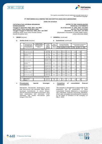 448 PT Pertamina Hulu Energi 2022Laporan TahunanAnnual ReportThe original consolidated financial statements included herein are in the Indonesian language.PT PERTAMINA HULU ENERGI TBK DAN ENTITAS ANAK/AND SUBSIDIARIES Daftar 5/9 ScheduleCATATAN ATAS LAPORAN KEUANGANKONSOLIDASIANTanggal 31 Desember 2022, 2021, dan 2020serta Untuk Tahun yang Berakhir pada Tanggal-Tanggal 31 Desember 2020, 2021, dan 2020(Disajikan dalam ribuan dolar Amerika Serikat, kecuali dinyatakan lain)NOTES TO THE CONSOLIDATEDFINANCIAL STATEMENTSAs of December 31, 2022, 2021, and 2020and For The Years Ended December 31, 2022, 2021, and 2020(Expressed in thousands of United States dollars,unless otherwise stated)1. UMUM (lanjutan) 1. GENERAL (continued)b. Entitas Anak (lanjutan) b. Subsidiaries (continued)c. Penyelesaian laporan keuangankonsolidasianc. Completion of consolidated financial statementsManajemen Perusahaan bertanggung jawab atas penyusunan dan penyajian wajar laporan keuangan konsolidasian ini sesuai dengan Standar Akuntansi Keuangan di Indonesia, yang telah diselesaikan dan diotorisasi untuk diterbitkan oleh Direksi Perusahaan pada tanggal 2 Mei 2023.The Company%u2019s management is responsible for the preparation and fair presentation of these consolidated financial statements in accordance with Indonesian Financial Accounting Standards, which were completed and authorized for issuance by the Board of Directors of the Company on May 2, 2023.No.Nama Entitas Anakdan Wilayah Kerja/Name of Subsidiariesand Working AreaTanggal perolehanIzin eksplorasi/ eksploitasi/Date of exploration/exploitation permitobtainedMulai beroperasi secara komersial/Start of commercial operationsTempat kedudukan/Place of domicilePersentase Kepemilikan/Percentage of OwnershipJumlah aset sebelum eliminasi/Total assets before elimination31 Des/Dec 202231 Des/Dec 202131 Des/Dec 202031 Des/Dec 202231 Des/Dec 202131 Des/Dec 2020Kepemilikan tidak langsung melalui/Indirectly owned through Elnusa: 11. PT Sigma Cipta Utama - 8 April 1980/April 8, 1980 Jakarta 99.99% 99.99% 99.99% 20.040 19.306 14.74912. PT Elnusa Fabrikasi Konstruksi - 7 Mei 1982/May 7, 1982 Batam 99,97% 99,97% 99,97% 22.935 19.953 15.98813. PT Elnusa Petrofin - 5 Juli 1996/July 5, 1996 Jakarta 99,99% 99,99% 99,99% 217.204 174.811 162.16214. PT Patra Nusa Data - 4 November 1987/ November 4, 1987 Jakarta 99,50% 99,50% 99,50% 8.930 9.393 10.51115. PT Elnusa Trans Samudera- 8 November 2013/ November 8, 2013 Jakarta 99,99% 99,99% 99,99% 35.306 38.632 37.03216. PT Elnusa Geosains Indonesia - 19 Oktober 2014/ October 19, 2014 Jakarta 99,99% 99,99% 99,99% 815 819 81617. PT Elnusa Oilfield Services - 19 Oktober 2014/ October 19, 2014 Jakarta 99,99% 99,99% 99,99% 2.847 2.877 2.66918. KSO Elnusa - RAGA - 12 Januari 2017/ January 12, 2017 Jakarta 100% 100% 100% 4.512 4.713 4.73319. PT Elnusa Daya Kreatif - 6 Maret 2015/ March 6, 2015 Jakarta 99,99% 99,99% 99,99% 641 700 709Kepemilikan tidak langsung melalui/Indirectly owned through PT Badak NGL.: 20.Badak Chiyoda Enerproco LLC (%u201cBChE%u201d)- 31 Mei 2017/May 31, 2017Texas, USA 51% 51% 51% 1.078 1.158 1.277