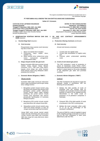 450 PT Pertamina Hulu Energi 2022Laporan TahunanAnnual ReportThe original consolidated financial statements included herein are in the Indonesian language.PT PERTAMINA HULU ENERGI TBK DAN ENTITAS ANAK/AND SUBSIDIARIES Daftar 5/11 ScheduleCATATAN ATAS LAPORAN KEUANGANKONSOLIDASIANTanggal 31 Desember 2022, 2021, dan 2020serta Untuk Tahun yang Berakhir pada Tanggal-Tanggal 31 Desember 2020, 2021, dan 2020(Disajikan dalam ribuan dolar Amerika Serikat, kecuali dinyatakan lain)NOTES TO THE CONSOLIDATEDFINANCIAL STATEMENTSAs of December 31, 2022, 2021, and 2020and For The Years Ended December 31, 2022, 2021, and 2020(Expressed in thousands of United States dollars,unless otherwise stated)2. KESEPAKATAN KONTRAK MINYAK DAN GAS BUMI (lanjutan)2. OIL AND GAS CONTRACT ARRANGEMENTS (continued)a. Kontrak Bagi Hasil (lanjutan) a. Production Sharing Contracts (continued)iii. Cost recovery iii. Cost recoveryPengembalian biaya operasi (cost recovery) tiap tahun terdiri dari:Annual cost recovery comprises:i. Biaya non-kapital tahun berjalan; i. Current year non-capital costs;ii. Penyusutan biaya kapital tahun berjalan; danii. Current year amortization of capital costs; andiii. Biaya operasi tahun sebelumnya yang belum memperoleh penggantian (unrecovered costs). iii. Previous years unrecovered operating costs.iv. Harga minyak mentah dan gas bumi iv. Crude oil and natural gas pricesBagian kontraktor KBH atas produksi minyak mentah dinilai dengan Harga Minyak Indonesia (%u201cICP%u201d). Gas bumi yang dikirim kepada pihak ketiga dan pihak berelasi dinilai dengan harga yang ditetapkan dalam perjanjian jual beli gas.The PSC contractors%u2019 crude oil production is priced at Indonesian Crude Prices (%u201cICP%u201d). Natural gas delivered to third parties and related parties is valued based on the prices stipulated in the respective gas sales and purchase contracts.v. Domestic Market Obligation (%u201cDMO%u201d) v. Domestic Market Obligation (%u201cDMO%u201d)Minyak mentah Crude oil Kontraktor KBH wajib memenuhi kebutuhan dalam negeri berdasarkan perhitungan setiap tahun sebagai berikut:The PSC Contractors are required to supply the domestic market in accordance with the following annual calculation:1. Mengalikan jumlah minyak mentah yang diproduksi dari wilayah kerja dengan hasil pembagian antara jumlah kebutuhan minyak mentah dalam negeri sebagai pembilang dan jumlah seluruh minyak mentah yang diproduksi oleh seluruh perusahaan perminyakan di Indonesiasebagai penyebut.1. Multiply the total quantity of crude oil produced from the contract area by a fraction, the numerator of which is the total quantity of crude oil to be supplied and the denominator is the entire crude oil production of all petroleum companies in Indonesia.2. Menghitung 25% jumlah minyak mentah yang diproduksi dari wilayah kerja KBH.2. Compute 25% of the total quantity of crude oil produced in the PSC%u2019s working area.3. Mengalikan jumlah minyak mentah yang lebih kecil antara hitungan (1) atau (2) dengan persentase bagi hasil kontraktor.3. Multiply the lower computed, either under (1) or (2) by the percentage of the contractor%u2019s entitlement.Harga DMO untuk minyak mentah adalah harga rata-rata tertimbang dari seluruh jenis minyak mentah yang dijual oleh kontraktor KBH atau harga lain yang ditentukan dalam KBH tersebut.The price of DMO for crude oil supplied is equal to the weighted average of all types of crude oil sold by the PSC contractors or other price determined under the PSC.