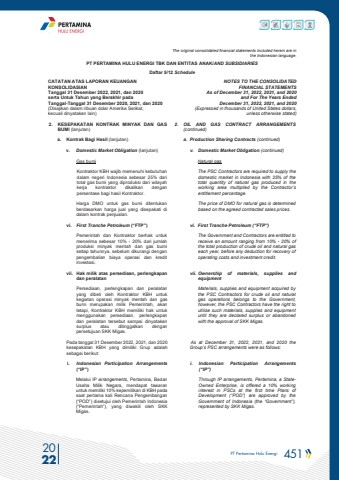 PT Pertamina Hulu Energi 451 2022The original consolidated financial statements included herein are in the Indonesian language.PT PERTAMINA HULU ENERGI TBK DAN ENTITAS ANAK/AND SUBSIDIARIES Daftar 5/12 ScheduleCATATAN ATAS LAPORAN KEUANGANKONSOLIDASIANTanggal 31 Desember 2022, 2021, dan 2020serta Untuk Tahun yang Berakhir pada Tanggal-Tanggal 31 Desember 2020, 2021, dan 2020(Disajikan dalam ribuan dolar Amerika Serikat, kecuali dinyatakan lain)NOTES TO THE CONSOLIDATEDFINANCIAL STATEMENTSAs of December 31, 2022, 2021, and 2020and For The Years Ended December 31, 2022, 2021, and 2020(Expressed in thousands of United States dollars,unless otherwise stated)2. KESEPAKATAN KONTRAK MINYAK DAN GAS BUMI (lanjutan)2. OIL AND GAS CONTRACT ARRANGEMENTS (continued) a. Kontrak Bagi Hasil (lanjutan) a. Production Sharing Contracts (continued)v. Domestic Market Obligation (lanjutan) v. Domestic Market Obligation (continued)Gas bumi Natural gasKontraktor KBH wajib memenuhi kebutuhan dalam negeri Indonesia sebesar 25% dari total gas bumi yang diproduksi dari wilayah kerja kontraktor dikalikan dengan persentase bagi hasil Kontraktor. The PSC Contractors are required to supply the domestic market in Indonesia with 25% of the total quantity of natural gas produced in the working area multiplied by the Contractor%u2019s entitlement percentage. Harga DMO untuk gas bumi ditentukan berdasarkan harga jual yang disepakati di dalam kontrak penjualan.The price of DMO for natural gas is determined based on the agreed contracted sales prices.vi. First Tranche Petroleum (%u201cFTP%u201d) vi. First Tranche Petroleum (%u201cFTP%u201d)Pemerintah dan Kontraktor berhak untuk menerima sebesar 10% - 20% dari jumlah produksi minyak mentah dan gas bumi setiap tahunnya, sebelum dikurangi dengan pengembalian biaya operasi dan kredit investasi.The Government and Contractors are entitled to receive an amount ranging from 10% - 20% of the total production of crude oil and natural gas each year, before any deduction for recovery of operating costs and investment credit.vii. Hak milik atas persediaan, perlengkapan dan peralatanvii. Ownership of materials, supplies and equipmentPersediaan, perlengkapan dan peralatan yang dibeli oleh Kontraktor KBH untuk kegiatan operasi minyak mentah dan gas bumi merupakan milik Pemerintah, akan tetapi, Kontraktor KBH memiliki hak untuk menggunakan persediaan, perlengkapan dan peralatan tersebut sampai dinyatakan surplus atau ditinggalkan dengan persetujuan SKK Migas.Materials, supplies and equipment acquired by the PSC Contractors for crude oil and natural gas operations belongs to the Government, however, the PSC Contractors have the right to utilise such materials, supplies and equipment until they are declared surplus or abandoned with the approval of SKK Migas. Pada tanggal 31 Desember 2022, 2021, dan 2020kesepakatan KBH yang dimiliki Grup adalah sebagai berikut:As at December 31, 2022, 2021, and 2020 the Group%u2019s PSC arrangements were as follows:i. Indonesian Participation Arrangements(%u201cIP%u201d)i. Indonesian Participation Arrangements (%u201cIP%u201d)Melalui IP arrangements, Pertamina, Badan Usaha Milik Negara, mendapat tawaran untuk memiliki 10% kepemilikan di KBH pada saat pertama kali Rencana Pengembangan (%u201cPOD%u201d) disetujui oleh Pemerintah Indonesia (%u201cPemerintah%u201d), yang diwakili oleh SKK Migas. Through IP arrangements, Pertamina, a StateOwned Enterprise, is offered a 10% working interest in PSCs at the first time Plans of Development (%u201cPOD%u201d) are approved by the Government of Indonesia (the %u201cGovernment%u201d), represented by SKK Migas.