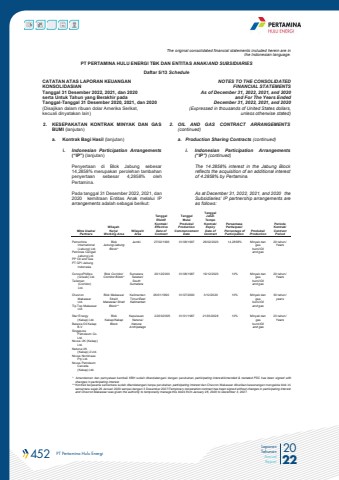 452 PT Pertamina Hulu Energi 2022Laporan TahunanAnnual ReportThe original consolidated financial statements included herein are in the Indonesian language.PT PERTAMINA HULU ENERGI TBK DAN ENTITAS ANAK/AND SUBSIDIARIES Daftar 5/13 ScheduleCATATAN ATAS LAPORAN KEUANGANKONSOLIDASIANTanggal 31 Desember 2022, 2021, dan 2020serta Untuk Tahun yang Berakhir pada Tanggal-Tanggal 31 Desember 2020, 2021, dan 2020(Disajikan dalam ribuan dolar Amerika Serikat, kecuali dinyatakan lain)NOTES TO THE CONSOLIDATEDFINANCIAL STATEMENTSAs of December 31, 2022, 2021, and 2020and For The Years Ended December 31, 2022, 2021, and 2020(Expressed in thousands of United States dollars,unless otherwise stated)2. KESEPAKATAN KONTRAK MINYAK DAN GAS BUMI (lanjutan)2. OIL AND GAS CONTRACT ARRANGEMENTS (continued)a. Kontrak Bagi Hasil (lanjutan) a. Production Sharing Contracts (continued)i. Indonesian Participation Arrangements(%u201cIP%u201d) (lanjutan)i. Indonesian Participation Arrangements (%u201cIP%u201d) (continued)Penyertaan di Blok Jabung sebesar 14,2858% merupakan perolehan tambahan penyertaan sebesar 4,2858% oleh Pertamina. The 14.2858% interest in the Jabung Block reflects the acquisition of an additional interest of 4.2858% by Pertamina. Pada tanggal 31 Desember 2022, 2021, dan 2020 kemitraan Entitas Anak melalui IParrangements adalah sebagai berikut:As at December 31, 2022, 2021, and 2020 the Subsidiaries%u2019 IP partnership arrangements are as follows:Mitra Usaha/PartnersWilayah Kerja/ Working AreaWilayah/AreaTanggalEfektif Kontrak/EffectiveDate of ContractTanggalMulai Produksi/Production Commencement DateTanggal Jatuh Tempo Kontrak/ExpiryDate of ContractPersentasePartisipasi/Percentage ofParticipationProduksi/ProductionPeriode Kontrak/ Contract Period Petrochina International (Jabung) Ltd. Petronas Carigali Jabung Ltd. PP Oil and Gas PT GPI JabungIndonesiaBlok Jabung/JabungBlock*Jambi 27/02/1993 01/08/1997 26/02/2023 14,2858% Minyak dan gas bumi/Oil and gas20 tahun/YearsConocoPhillips (Grissik) Ltd. Talisman (Corridor) Ltd. Blok Corridor/Corridor Block*Sumatera Selatan/SouthSumatera20/12/2003 01/08/1987 19/12/2023 10% Minyak dan gas bumi/Oil and gas20 tahun/YearsChevron Makassar Ltd. Tip Top Makassar Ltd. Blok Makassar Strait/ Makassar Strait Block**Kalimantan Timur/East Kalimantan26/01/1990 01/07/2000 3/12/2020 10% Minyak dan gas bumi/Oil and gas30 tahun/yearsStar Energy (Kakap) Ltd.Batavia Oil Kakap B.VSingapore Petroleum Co. Ltd. Novus UK (Kakap) Ltd. Natuna UK (Kakap) 2 Ltd.Novus Nominees Pty Ltd.Novus Petroleum Canada (Kakap) Ltd.Blok Kakap/Kakap BlockKepulauan Natuna/Natuna Archipelago22/03/2005 01/01/1987 21/03/2028 10% Minyak dan gas bumi/Oil and gas23 tahun/Years* Amandemen dan pernyataan kembali KBH sudah ditandatangani dengan perubahan participating interest/Amended & restated PSC has been signed with changes in participating interest. ** Kontrak kerjasama sementara sudah ditandatangani tanpa perubahan participating interest dan Chevron Makassar diberikan kewenangan mengelola blok ini sementara sejak 26 Januari 2020 sampai dengan 3 Desember 2027/Temporary cooperation contract has been signed without changes in participating interestand Chevron Makassar was given the authority to temporarily manage this block from January 26, 2020 to December 3, 2027.