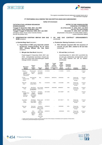 454 PT Pertamina Hulu Energi 2022Laporan TahunanAnnual ReportThe original consolidated financial statements included herein are in the Indonesian language.PT PERTAMINA HULU ENERGI TBK DAN ENTITAS ANAK/AND SUBSIDIARIES Daftar 5/15 ScheduleCATATAN ATAS LAPORAN KEUANGANKONSOLIDASIANTanggal 31 Desember 2022, 2021, dan 2020serta Untuk Tahun yang Berakhir pada Tanggal-Tanggal 31 Desember 2020, 2021, dan 2020(Disajikan dalam ribuan dolar Amerika Serikat, kecuali dinyatakan lain)NOTES TO THE CONSOLIDATEDFINANCIAL STATEMENTSAs of December 31, 2022, 2021, and 2020and For The Years Ended December 31, 2022, 2021, and 2020(Expressed in thousands of United States dollars,unless otherwise stated)2. KESEPAKATAN KONTRAK MINYAK DAN GAS BUMI (lanjutan)2. OIL AND GAS CONTRACT ARRANGEMENTS(continued)a. Kontrak Bagi Hasil (lanjutan) a. Production Sharing Contracts (continued)ii. Kepemilikan di KBH yang diperoleh setelah berlakunya Undang-Undang No. 22 tahun 2001, tentang Minyak dan Gas Bumi (lanjutan)ii. PSC interests acquired after the issuance of Law No. 22 year 2001, related to Oil and Gas(continued)1. Minyak dan Gas Bumi (lanjutan) 1. Oil and Gas (continued)Pada tanggal 31 Desember 2022, 2021, dan 2020, kesepakatan kemitraan minyak dan gas bumi yang telah ditandatangani adalah sebagai berikut: (lanjutan)As at December 31, 2022, 2021, and 2020, the oil and gas partnership arrangements which have been entered into are as follows:(continued)Mitra Usaha KBH/PSCPartnersWilayah Kerja/ Working AreaWilayah/AreaTanggalEfektif Kontrak/Effective Date of ContractTanggalMulai Produksi/Production Commencement DateTanggal Jatuh Tempo Kontrak/ Expiry Date of ContractPersentase Partisipasi/ Percentage of ParticipationProduksi/ ProductionPeriode Kontrak/ Contract PeriodVideocon Indonesia Nunukan BPRL Ventures Indonesia BVBlok Nunukan/Nunukan Block*Kalimantan Timur/East Kalimantan12/12/2004 - 11/12/2034 64,50% - 30 tahun/yearsPT Riau Petroleum Siak (%u201cRPS%u201d)Blok Siak/SiakBlock*Riau 26/05/2014 28/05/2014 25/05/2034 90% Minyak dan gas bumi/Oil and gas20 tahun/yearsTidak ada/NoneBlok Kampar/Kampar Block* Riau 01/01/2016 7/1993 01/01/2036 100% Minyak dan gas bumi/Oil and gas20 tahun/yearsTidak ada/ None Blok Randugunting/Randugunting Block*Jawa Tengah/Central Java 09/08/2007 20/02/2020 08/08/2037 100% Minyak dan gas bumi/Oil and gas30 tahun/yearsPetronas Carigali (West Glagah Kambuna) Sdn. Bhd.Blok West Glagah Kambuna/West Glagah Kambuna Block Sumatera Utara/North Sumatera30/11/2009 - 29/11/2039** 40% - 30 tahun/yearsInpex Babar Selaru Limited Blok Babar Selaru/Babar Selaru BlockMaluku Lepas Pantai/ Offshore Maluku21/11/2011 - 20/11/2041** 15% Minyak dan gas bumi/Oil and gas30 tahun/yearsTidak ada/NoneBlok Abar/ Abar Block*Jawa Barat Lepas Pantai/Offshore West Java22/05/2015 - 22/05/2045 100% Minyak dan gas bumi/Oil and gas30 tahun/yearsTidak ada/NoneBlok Anggursi/ AnggursiBlock*Utara Jawa Barat Lepas Pantai/ Offshore North West Java22/05/2015 - 22/05/2045 100% Minyak dan gas bumi/Oil and gas30 tahun/years* Entitas Anak Perusahaan ini adalah operator atas blok-blok ini/The Company%u2019s Subsidiaries are the operators of these blocks. ** Relinquish ke pemerintah/Relinquish to government.