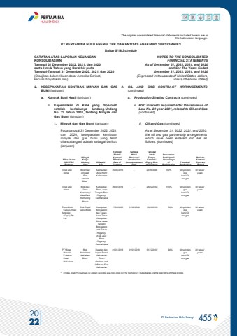 PT Pertamina Hulu Energi 455 2022The original consolidated financial statements included herein are in the Indonesian language.PT PERTAMINA HULU ENERGI TBK DAN ENTITAS ANAK/AND SUBSIDIARIES Daftar 5/16 ScheduleCATATAN ATAS LAPORAN KEUANGANKONSOLIDASIANTanggal 31 Desember 2022, 2021, dan 2020serta Untuk Tahun yang Berakhir pada Tanggal-Tanggal 31 Desember 2020, 2021, dan 2020(Disajikan dalam ribuan dolar Amerika Serikat, kecuali dinyatakan lain)NOTES TO THE CONSOLIDATEDFINANCIAL STATEMENTSAs of December 31, 2022, 2021, and 2020and For The Years Ended December 31, 2022, 2021, and 2020(Expressed in thousands of United States dollars,unless otherwise stated)2. KESEPAKATAN KONTRAK MINYAK DAN GAS BUMI (lanjutan)2. OIL AND GAS CONTRACT ARRANGEMENTS(continued)a. Kontrak Bagi Hasil (lanjutan) a. Production Sharing Contracts (continued)ii. Kepemilikan di KBH yang diperoleh setelah berlakunya Undang-Undang No. 22 tahun 2001, tentang Minyak dan Gas Bumi (lanjutan)ii. PSC interests acquired after the issuance of Law No. 22 year 2001, related to Oil and Gas(continued)1. Minyak dan Gas Bumi (lanjutan) 1. Oil and Gas (continued)Pada tanggal 31 Desember 2022, 2021,dan 2020, kesepakatan kemitraanminyak dan gas bumi yang telah ditandatangani adalah sebagai berikut: (lanjutan)As at December 31, 2022, 2021, and 2020, the oil and gas partnership arrangements which have been entered into are as follows: (continued)Mitra Usaha KBH/PSCPartnersWilayah Kerja/ Working AreaWilayah/AreaTanggalEfektif Kontrak/Effective Date of ContractTanggalMulai Produksi/Production Commencement DateTanggal Jatuh Tempo Kontrak/ Expiry Date of ContractPersentase Partisipasi/ Percentage of ParticipationProduksi/ ProductionPeriode Kontrak/ Contract PeriodTidak ada/NoneBlok East Ambalat/EastAmbalat Block* Kalimantan Utara/North Kalimantan25/05/2016 - 25/05/2046 100% Minyak dan gas bumi/Oil and gas30 tahun/yearsTidak ada/NoneBlok Alas Dara Kemuning/ Alas DaraKemuningBlock* Kabupaten Blora, Jawa Tengah/BloraRegency, Central Java26/02/2014 - 26/02/2044 100% Minyak dan gas bumi/Oil and gas30 tahun/yearsExxonMobil Cepu Limited Ampolex (Cepu) Pte. Ltd. Blok Cepu/Cepu BlockKabupaten Bojonegoro dan Tuban, Jawa TimurKabupaten Blora, Jawa Tengah/ Bojonegoroand Tuban Regency, East JavaBlora Regency, Central Java 17/09/2005 31/08/2009 16/09/2035 50% Minyak dan gas bumi/Oil and gas30 tahun/yearsPT Migas Mandiri PratamaKutai MahakamBlokMahakam/ MahakamBlock*Daratan dan Lepas Pantai Kalimantan Timur/Onshore and Offshore East Kalimantan01/01/2018 01/01/2018 31/12/2037 90% Minyak dan gas bumi/Oil and gas20 tahun/years* Entitas Anak Perusahaan ini adalah operator atas blok-blok ini/The Company%u2019s Subsidiaries are the operators of these blocks.