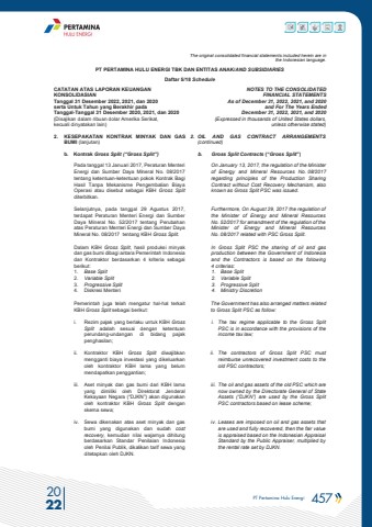 PT Pertamina Hulu Energi 457 2022The original consolidated financial statements included herein are in the Indonesian language.PT PERTAMINA HULU ENERGI TBK DAN ENTITAS ANAK/AND SUBSIDIARIES Daftar 5/18 ScheduleCATATAN ATAS LAPORAN KEUANGANKONSOLIDASIANTanggal 31 Desember 2022, 2021, dan 2020serta Untuk Tahun yang Berakhir pada Tanggal-Tanggal 31 Desember 2020, 2021, dan 2020(Disajikan dalam ribuan dolar Amerika Serikat, kecuali dinyatakan lain)NOTES TO THE CONSOLIDATEDFINANCIAL STATEMENTSAs of December 31, 2022, 2021, and 2020and For The Years Ended December 31, 2022, 2021, and 2020(Expressed in thousands of United States dollars,unless otherwise stated)2. KESEPAKATAN KONTRAK MINYAK DAN GAS BUMI (lanjutan)2. OIL AND GAS CONTRACT ARRANGEMENTS(continued) b. Kontrak Gross Split (%u201cGross Split%u201d) b. Gross Split Contracts (%u201cGross Split%u201d)Pada tanggal 13 Januari 2017, Peraturan Menteri Energi dan Sumber Daya Mineral No. 08/2017 tentang ketentuan-ketentuan pokok Kontrak Bagi Hasil Tanpa Mekanisme Pengembalian Biaya Operasi atau disebut sebagai KBH Gross Splitditerbitkan. On January 13, 2017, the regulation of the Minister of Energy and Mineral Resources No. 08/2017 regarding principles of the Production Sharing Contract without Cost Recovery Mechanism, also known as Gross Split PSC was issued. Selanjutnya, pada tanggal 29 Agustus 2017, terdapat Peraturan Menteri Energi dan Sumber Daya Mineral No. 52/2017 tentang Perubahan atas Peraturan Menteri Energi dan Sumber Daya Mineral No. 08/2017 tentang KBH Gross Split.Furthermore, On August 29, 2017 the regulation of the Minister of Energy and Mineral Resources No. 52/2017 for amandment of the regulation of the Minister of Energy and Mineral Resources No. 08/2017 related with PSC Gross Split.Dalam KBH Gross Split, hasil produksi minyak dan gas bumi dibagi antara Pemerintah Indonesia dan Kontraktor berdasarkan 4 kriteria sebagai berikut:1. Base Split 2. Variable Split3. Progressive Split4. Diskresi MenteriIn Gross Split PSC the sharing of oil and gas production between the Government of Indonesia and the Contractors is based on the following 4 criterias: 1. Base Split 2. Variable Split3. Progressive Split 4. Ministry DiscretionPemerintah juga telah mengatur hal-hal terkait KBH Gross Split sebagai berikut:The Government has also arranged matters related to Gross Split PSC as folloi. Rezim pajak yang berlaku untuk KBH Gross Split adalah sesuai dengan ketentuan perundang-undangan di bidang pajak penghasilan;i. The tax regime applicable to the Gross Split PSC is in accordance with the provisions of the income tax law;ii. Kontraktor KBH Gross Split diwajibkan mengganti biaya investasi yang dikeluarkan oleh kontraktor KBH lama yang belum mendapatkan penggantian;ii. The contractors of Gross Split PSC must reimburse unrecovered investment costs to the old PSC contractors;iii. Aset minyak dan gas bumi dari KBH lama yang dimiliki oleh Direktorat Jenderal Kekayaan Negara (%u201cDJKN%u201d) akan digunakan oleh kontraktor KBH Gross Split dengan skema sewa;iii. The oil and gas assets of the old PSC which are now owned by the Directorate General of State Assets (%u201cDJKN%u201d) are used by the Gross Split PSC contractors based on lease scheme; iv. Sewa dikenakan atas aset minyak dan gas bumi yang digunakan dan sudah cost recovery, kemudian nilai wajarnya dihitung berdasarkan Standar Penilaian Indonesia oleh Penilai Publik, dikalikan tarif sewa yang ditetapkan oleh DJKN.iv. Leases are imposed on oil and gas assets that are used and fully recovered, then the fair value is appraised based on the Indonesian Appraisal Standard by the Public Appraiser, multiplied by the rental rate set by DJKN.