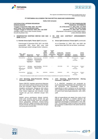 PT Pertamina Hulu Energi 459 2022The original consolidated financial statements included herein are in the Indonesian language.PT PERTAMINA HULU ENERGI TBK DAN ENTITAS ANAK/AND SUBSIDIARIES Daftar 5/20 ScheduleCATATAN ATAS LAPORAN KEUANGANKONSOLIDASIANTanggal 31 Desember 2022, 2021, dan 2020serta Untuk Tahun yang Berakhir pada Tanggal-Tanggal 31 Desember 2020, 2021, dan 2020(Disajikan dalam ribuan dolar Amerika Serikat, kecuali dinyatakan lain)NOTES TO THE CONSOLIDATEDFINANCIAL STATEMENTSAs of December 31, 2022, 2021, and 2020and For The Years Ended December 31, 2022, 2021, and 2020(Expressed in thousands of United States dollars,unless otherwise stated)2. KESEPAKATAN KONTRAK MINYAK DAN GAS BUMI (lanjutan)2. OIL AND GAS CONTRACT ARRANGEMENTS (continued)b. Kontrak Gross Split (%u201cGross Split%u201d) (lanjutan) b. Gross Split Contracts (%u201cGross Split%u201d) (continued)Pada tanggal 31 Desember 2022, 2021, dan 2020, kesepakatan KBH Gross Split yang telah ditandatangani adalah sebagai berikut: (lanjutan)As at December 31, 2022, 2021, and 2020, the signed Gross Split PSC are as follo (continued)Mitra Usaha KBH/PSCPartnersWilayah Kerja/ Working AreaWilayah/AreaTanggalEfektif Kontrak/Effective Date of ContractTanggalMulai Produksi/Production Commencement DateTanggal Jatuh Tempo Kontrak/ Expiry Date of ContractPersentase Partisipasi/ Percentage of ParticipationProduksi/ ProductionPeriode Kontrak/ Contract PeriodTidak ada/None Blok East Kalimantan dan Attaka/East Kalimantan and Attaka Block* Daratan dan Lepas Pantai Kalimantan Timur/Onshore and Offshore East Kalimantan25/10/2018 25/10/2018 24/10/2038 100% Minyak dan gas bumi/Oil and gas20 tahun/yearsEni West Ganal Ltd Neptune Energy West Ganal B.V.Blok West Ganal/West Ganal Block Lepas Pantai Selat Makassar/Offshore Makassar Strait 26/01/2020 - 25/01/2050 30% Minyak dan gas bumi/Oil and gas30 tahun/yearsTidak ada/None Blok Rokan/Rokan Block* Riau 09/08/2021 09/08/2021 09/08/2041 100% Minyak dan gas bumi/Oil and gas20 tahun/years* Entitas Anak Perusahaan ini adalah operator atas blok-blok ini/The Company%u2019s Subsidiaries are the operators of these blocks. c. Joint Operating Body-Production Sharing Contracts (%u201cJOB-PSC%u201d)c. Joint Operating Body-Production Sharing Contracts (%u201cJOB-PSC%u201d)Dalam JOB-PSC, kegiatan operasional dilakukan oleh suatu badan operasi bersama antara Entitas Anak dan kontraktor. Bagian Entitas Anak atas kewajiban pembiayaan ditanggung lebih dahulu oleh para kontraktor dan dibayar oleh Entitas Anak melalui bagiannya atas produksi minyak mentah dan gas bumi, ditambah dengan 50% uplift.In a JOB-PSC, operations are conducted by a joint operating body between the Subsidiaries and the contractors. The Subsidiaries%u2019 share of expenditures is paid in advance by the contractors and is repaid by the Subsidiaries out of their share of crude oil and natural gas production, with a 50% uplift. Setelah semua pembiayaan dibayar kembali, maka hasil produksi minyak mentah dan gas bumi dibagi antara Entitas Anak dan kontraktor sesuai persentase partisipasi masing-masing dalam JOB-PSC. Bagian kontraktor atas produksi minyak mentah dan gas bumi ditentukan dengan cara yang sama sesuai KBH.After all expenditures are repaid, the crude oil and natural gas production is divided between the Subsidiaries and the contractors based on their respective percentages of participation in the JOBPSC. The contractors%u2019 share of crude oil and natural gas production is determined in the same manner as for a PSC.