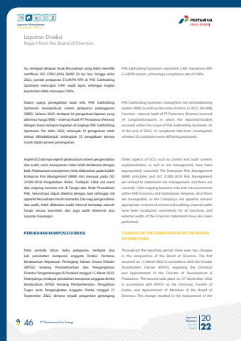 46 PT Pertamina Hulu Energi 2022Laporan TahunanAnnual ReportLaporan ManajemenManagement Reportitu, terdapat delapan Anak Perusahaan yang telah memiliki sertifikasi ISO 37001:2016 SMAP. Di sisi lain, hingga akhir 2022, jumlah pelaporan E-LHKPN KPK di PHE Subholding Upstream mencapai 3.991 wajib lapor, sehingga tingkat kepatuhan telah mencapai 100%.Dalam upaya penegakkan kode etik, PHE Subholding Upstream memperkuat sistem pelaporan pelanggaran (WBS). Selama 2022, terdapat 54 pengaduan/laporan yang diterima Fungsi WBS %u2013 Internal Audit PT Pertamina (Persero) dengan lokasi terlapor/kejadian di lingkup PHE Subholding Upstream. Per akhir 2022, sebanyak 19 pengaduan telah selesai ditindaklanjuti, sedangkan 35 pengaduan lainnya masih dalam proses penanganan.Aspek GCG lainnya seperti pelaksanaan sistem pengendalian dan audit, serta manajemen risiko telah terlaksana dengan baik. Pelaksanaan manajemen risiko didasarkan pada kaidah Enterprise Risk Management (ERM) dan merujuk pada ISO 31000-2018 Pengelolaan Risiko. Terdapat 1.664 risk eventdan ongoing business risk di Fungsi dan Anak Perusahaan PHE. Seluruhnya dapat dikelola dengan baik sehingga risk appetite Perusahaan masih memadai. Dari segi pengendalian dan audit, telah dilakukan audit internal terhadap seluruh fungsi secara konsisten dan juga audit eksternal atas Laporan Keuangan. PERUBAHAN KOMPOSISI DIREKSIPada periode tahun buku pelaporan, terdapat dua kali perubahan komposisi anggota Direksi. Pertama, berdasarkan Keputusan Pemegang Saham Secara Sirkuler (KPSSS) tentang Pemberhentian dan Pengangkatan Direktur Pengembangan & Produksi tanggal 15 Maret 2022. Selanjutnya, terdapat perubahan komposisi anggota direksi berdasarkan KPSSS tentang Pemberhentian, Pengalihan Tugas serta Pengangkatan Anggota Direksi tanggal 27 September 2022, dimana terjadi pergantian pemegang PHE Subholding Upstream submitted 3,991 mandatory KPK E-LHKPN reports, achieving a compliance rate of 100%.PHE Subholding Upstream strengthens the whistleblowing system (WBS) to enforce the code of ethics. In 2022, the WBS Function - Internal Audit of PT Pertamina (Persero) received 54 complaints/reports in which the reported/incident occurred within the scope of PHE Subholding Upstream. As of the end of 2022, 19 complaints had been investigated, whereas 35 complaints were still being processed.Other aspects of GCG, such as control and audit systems implementation, as well as risk management, have been appropriately executed. The Enterprise Risk Management (ERM) principles and ISO 31000-2018 Risk Management are utilized to implement risk management, and there are currently 1,664 ongoing business risks and risk occurrences within PHE Functions and Subsidiaries. However, all of them are manageable, so the Company%u2019s risk appetite remains appropriate. In terms of control and auditing, internal audits have been conducted consistently for all functions, and external audits of the Financial Statements have also been performed.CHANGES IN THE COMPOSITION OF THE BOARD OF DIRECTORSThroughout the reporting period, there were two changes in the composition of the Board of Directors. The first occurred on 15 March 2022 in accordance with the Circular Shareholders Decree (KPSSS) regarding the Dismissal and Appointment of the Director of Development & Production. The second took place on 27 September 2022 in accordance with KPSSS on the Dismissal, Transfer of Duties, and Appointment of Members of the Board of Directors. This change resulted in the replacement of the Report from the Board of DirectorsLaporan Direksi