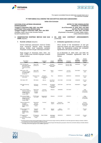 PT Pertamina Hulu Energi 463 2022The original consolidated financial statements included herein are in the Indonesian language.PT PERTAMINA HULU ENERGI TBK DAN ENTITAS ANAK/AND SUBSIDIARIES Daftar 5/24 ScheduleCATATAN ATAS LAPORAN KEUANGANKONSOLIDASIANTanggal 31 Desember 2022, 2021, dan 2020serta Untuk Tahun yang Berakhir pada Tanggal-Tanggal 31 Desember 2020, 2021, dan 2020(Disajikan dalam ribuan dolar Amerika Serikat, kecuali dinyatakan lain)NOTES TO THE CONSOLIDATEDFINANCIAL STATEMENTSAs of December 31, 2022, 2021, and 2020and For The Years Ended December 31, 2022, 2021, and 2020(Expressed in thousands of United States dollars,unless otherwise stated)2. KESEPAKATAN KONTRAK MINYAK DAN GAS BUMI (lanjutan)2. OIL AND GAS CONTRACT ARRANGEMENTS (continued)f. Kontrak unitisasi (lanjutan) f. Unitisation agreements (continued)Karena beberapa pelamparan reservoir Entitas Anak memasuki Wilayah Kerja Kontraktor lainnya, Entitas Anak melakukan perikatan Perjanjian Unitisasi dengan beberapa kontraktor. Since several of the Subsidiaries%u2019 oil and gas reservoirs extend into other Contractor%u2019s Working Areas, the Subsidiaries entered into Unitisation Agreements with several contractors.Pada tanggal 31 Desember 2022, 2021, dan 2020, Entitas Anak memiliki Perjanjian Unitisasi sebagai berikut:As at December 31, 2022, 2021, and 2020, the Subsidiaries%u2019 Unitisation Agreements were as follows:Para Pihak/Parties OperatorLapangan/ FieldLokasi/LocationMulai Perjanjian/ Start of the AgressmentProduksi/ProductionAkhir Perjanjian/End of the AgreementPeriode Perjanjian/ AgreementPeriodPHE Jambi Merang, Medco E&P (Grissik) Ltd, PHE Corridor, Talisman (Corridor) Ltd. Medco E&P (Grissik) Ltd. Gelam* Sumatera Selatan/ South Sumatera10/02/2019 Februari 1989/February 198909/02/2042 23 tahun/yearsPHE Corridor, PEP, Talisman (Corridor) Ltd., Medco E&P (Grissik) Ltd. Medco E&P (Grissik) Ltd. Suban Suban,Jambi11/03/2013 Juni 2011 /June 201123/01/2023* 10 tahun/yearsPHE Siak, Pertamina Hulu Rokan Pertamina HuluRokan Manggala South dan/andBatangRiau 28/05/2014 28/05/2014 28/05/2034 20 tahun/yearsPHE ONWJ, PEP PHE ONWJ MB Unit Jawa Barat/ West Java23/12/1985 23/12/1985 16/09/2035 50 tahun/yearsPHE Ogan Komering, PEPPHE OganKomering Air Serdang Air Serdang, Sumatera Selatan/SouthSumatra22/07/1991 22/07/1991 16/09/2035** 44 tahun/yearsShell, Conoco Phillips Sabah Ltd, Petronas Carigali Sdn.Bhd., PTTEP Sabah Oil Limited, PMEPSabah Shell Petroleum Company Limited Gumusut Kakap Field Malaysia 20/09/2004 18/11/2012 - Tidak disebutkan/ Not specified Shell, Conoco Phillips Sabah Ltd, Petronas Carigali Sdn.Bhd., PTTEP Sabah Oil Limited, PMEPPTTEP Sabah Oil Limited Siakap North Petai Field Malaysia 01/01/2007 28/02/2014 - Tidak disebutkan/ Not specified Talisman (Algeria) B.V., Sonatrach, Anadarko, Eni, Maersk, Cepsa, PAEPOrganisation Ourhoud (Sonatrach, Cepsa) Ourhoud Aljazair/AlgeriaDesember/December 19972002 - 25 tahundan 6 bulan/ 25 years and 6 monthsTalisman (Algeria) B.V., Sonatrach, Anadarko, Eni, Maersk, Cepsa, PAEPGropment Berkine (Sonatrach, Anadarko)EMK Aljazair/Algeria Maret/March 20072013 - 25 tahun/yearsPT Pertamina Hulu MahakamPT Pertamina Hulu Sanga SangaPT Pertamina Hulu Sanga SangaNilam & Badak Kalimantan Timur/East Kalimantan08/08/2018 08/08/2018 31/12/2037 20 tahun/years* Perjanjian tambahan terkait unitisasi efektif tanggal 10 Februari 2019 sampai dengan berakhirnya KBH Blok Corridor/Side agreement relating to unitization effective on 10 February 2019 until the expiration of PSC Block Corridor ** Kesepakatan bersama terkait unitisasi efektif tanggal 20 Mei 2018 sampai dengan ditandatanganinya perjanjian unitisasi baru/Joint letter relating to unitization effective on 20 May 2018 until the signing of a new unitization agreement