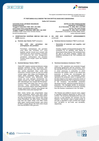 466 PT Pertamina Hulu Energi 2022Laporan TahunanAnnual ReportThe original consolidated financial statements included herein are in the Indonesian language.PT PERTAMINA HULU ENERGI TBK DAN ENTITAS ANAK/AND SUBSIDIARIES Daftar 5/27 ScheduleCATATAN ATAS LAPORAN KEUANGANKONSOLIDASIANTanggal 31 Desember 2022, 2021, dan 2020serta Untuk Tahun yang Berakhir pada Tanggal-Tanggal 31 Desember 2020, 2021, dan 2020(Disajikan dalam ribuan dolar Amerika Serikat, kecuali dinyatakan lain)NOTES TO THE CONSOLIDATEDFINANCIAL STATEMENTSAs of December 31, 2022, 2021, and 2020and For The Years Ended December 31, 2022, 2021, and 2020(Expressed in thousands of United States dollars,unless otherwise stated)2. KESEPAKATAN KONTRAK MINYAK DAN GAS BUMI (lanjutan)2. OIL AND GAS CONTRACT ARRANGEMENTS (continued)g. Kontrak Jasa Teknik (%u201cKJT%u201d) (lanjutan) g. Technical Service Contract (%u201cTSC%u201d) (continued)- Hak milik atas persediaan dan perlengkapan, dan peralatan- Ownership of materials and supplies, and equipmentPersediaan, perlengkapan, dan peralatan yang dibeli oleh kontraktor KJT untuk kegiatan operasi minyak bumi menjadi milik Pemerintah Irak, namun demikian, kontraktor KJT mempunyai hak untuk menggunakan persediaan, perlengkapan, dan peralatan tersebut sesuai dengan tujuan dan batasan pada KJT.Inventory, supplies, and equipments bought by TSC contractors for oil operation shall belong to Government of Iraq, however TSC contractors have the right to use those inventory, supplies and equipment according to the TSC%u2019s purposes and limitations.h. Kontrak Bantuan Teknis (%u201cKBT%u201d) h. Technical Assistance Contracts (%u201cTAC%u201d)Dalam KBT, kegiatan operasional dilakukan melalui perjanjian kemitraan dengan Perusahaan. KBT diberikan pada lapangan yang telah berproduksi, atau pernah berproduksi tetapi sudah tidak berproduksi. Produksi minyak dan gas bumi dibagi menjadi bagian tidak dibagi (non-shareable) dan bagian dibagi (shareable). Bagian tidak dibagi merupakan produksi yang diperkirakan dapat dicapai dari suatu lapangan (berdasarkan tren historis produksi dari suatu lapangan) pada saat KBT ditandatangani dan menjadi hak Perusahaan. Produksi bagian tidak dibagi akan menurun setiap tahunnya, yang mencerminkan ekspektasi penurunan produksi. Bagian dapat dibagi berkaitan dengan penambahan produksi yang berasal dari investasi Mitra Usaha pada lapangan KBT.Under a TAC, operations are conducted through partnership agreements with the Company. TACs are awarded for fields which currently in production, or which previously in production, in which production had ceased. Crude oil and natural gas production is divided into non-shareable and shareable portions. The non-shareable portion represents the production which is expected form the field (based on the historic production trends of the field) at the time the TAC is signed and accrued to the Company. Non-shareable production decreases annually, reflecting expected declines in production. The shareable portion of production corresponds to the additional production resulting from the Partners%u2019 investments in the TAC fields.Mitra Usaha berhak atas pengembalian biaya dengan pembatasan tertentu yang diatur dalam masing-masing kontrak. Sisa bagian dibagi setelah dikurangi pengembalian biaya operasi akan dibagi antara Perusahaan dan Mitra Usaha. Persentasi bagi hasil sisa bagian dibagi untuk Mitra Usaha diatur dalam masing-masing kontrak, yaitu antara 26,7857% sampai dengan 35,7143% untuk minyak bumi dan 62,5000% untuk gas bumi. The Partners are entitled to recover costs, subject to specified limitations depending on each of the contract. The remaining shareable portion less cost recovery is split between the Company and the Partners. The Partners%u2019 share of equity (profit) oil and gas is stipulated in each contract and ranges from 26.7857% to 35.7143% and 62.5000%, respectively.
