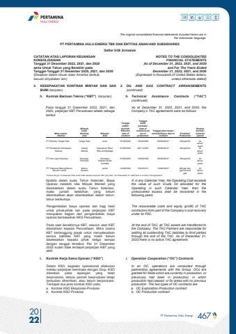 PT Pertamina Hulu Energi 467 2022The original consolidated financial statements included herein are in the Indonesian language.PT PERTAMINA HULU ENERGI TBK DAN ENTITAS ANAK/AND SUBSIDIARIES Daftar 5/28 ScheduleCATATAN ATAS LAPORAN KEUANGANKONSOLIDASIANTanggal 31 Desember 2022, 2021, dan 2020serta Untuk Tahun yang Berakhir pada Tanggal-Tanggal 31 Desember 2020, 2021, dan 2020(Disajikan dalam ribuan dolar Amerika Serikat, kecuali dinyatakan lain)NOTES TO THE CONSOLIDATEDFINANCIAL STATEMENTSAs of December 31, 2022, 2021, and 2020and For The Years Ended December 31, 2022, 2021, and 2020(Expressed in thousands of United States dollars,unless otherwise stated)2. KESEPAKATAN KONTRAK MINYAK DAN GAS BUMI (lanjutan)2. OIL AND GAS CONTRACT ARRANGEMENTS (continued)h. Kontrak Bantuan Teknis (%u201cKBT%u201d) (lanjutan) h. Technical Assistance Contracts (%u201cTAC%u201d)(continued)Pada tanggal 31 Desember 2022, 2021, dan 2020, perjanjian KBT Perusahaan adalah sebagai berikut:As at December 31, 2022, 2021, and 2020, the Company%u2019s TAC agreements were as follows:Mitra usaha/ PartnerWilayah kerja/Working areaWilayah/ AreaTanggal efektif kontrak/Effective date of contractTanggal mulai produksi/ Date of commencement of productionTanggal jatuh tempo kontrak/Expiry date of contractProduksi/ProductionPeriode kontrak/ Contract periodPT Eksindo Telaga Said Telaga Said Aceh 07/08/2002 16/02/2006 06/08/2022* Minyak/Oil 20tahun/yearsPT Pertalahan Amebatara NatunaUdang NatunaKepulauan Riau/Riau Archipelago 07/08/2002 28/11/2005 06/08/2022* Minyak/Oil 20tahun/yearsPT Indo Jaya Sukaraja Sukaraja, PendopoSumatera Selatan/South Sumatra07/08/2002 19/06/2008 06/08/2022* Minyak/Oil 20tahun/yearsPT Prakarsa Betung Meruo Senami JambiMeruo SenamiJambi 14/08/2002 15/02/2012 13/08/2022* Minyak dan gas/Oil and gas20tahun/years*Sampai dengan 31 Desember 2022 sudah tidak terdapat perjanjian KBT yang aktif / As of December 31, 2022 there is no active TAC agreement.Apabila dalam suatu Tahun Kalender, Biaya Operasi melebihi nilai Minyak Mentah yang dialokasikan dalam suatu Tahun Kalender, maka jumlah kelebihan yang belum dikembalikan akan dikembalikan dalam tahuntahun berikutnya.If, in any Calendar Year, the Operating Cost exceeds the value of such Crude Oil allocated for the Operating in such Calendar Year, then the unrecovered excess shall be recovered in the following years.Pengembalian biaya operasi dan bagi hasil untuk pihak-pihak lain pada perjanjian KBT merupakan bagian dari pengembalian biaya operasi berdasarkan KKS Perusahaan.The recoverable costs and equity (profit) of TAC contractors form part of the Company%u2019s cost recovery under its PSC.Pada saat berakhirnya KBT, seluruh aset KBT diserahkan kepada Perusahaan. Mitra Usaha KBT bertanggung jawab untuk menyelesaikan semua liabilitas KBT yang masih belum diselesaikan kepada pihak ketiga sampai dengan tanggal tersebut. Per 31 Desember 2022 sudah tidak terdapat perjanjian KBT yang aktif.At the end of TAC, all TAC assets are transferred to the Company. The TAC Partners are responsible for settling all outstanding TAC liabilities to third parties through the end of the TAC. As of December 31, 2022 there is no active TAC agreement.i. Kontrak Kerja Sama Operasi (%u201cKSO%u201d) i. Operation Cooperation (%u201cOC%u201d) ContractsDalam KSO, kegiatan operasional dilakukan melalui perjanjian kemitraan dengan Grup. KSO diberikan pada lapangan yang telah berproduksi, dahulu pernah berproduksi tetapi kemudian dihentikan, atau belum berproduksi. Terdapat dua jenis kontrak KSO yaitu:a. Kontrak KSO Eksplorasi-Produksib. Kontrak KSO Produksi In an OC, operations are conducted through partnership agreements with the Group. OCs are granted for fields which are currently in production, or previously had been in production, in which production had ceased, or for areas with no previous production. The two types of OC contracts are:a. OC Exploration-Production contractb. OC Production contract