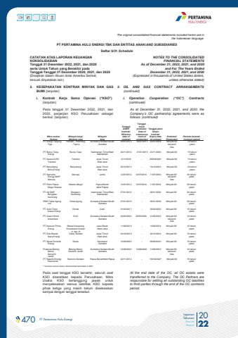 470 PT Pertamina Hulu Energi 2022Laporan TahunanAnnual ReportThe original consolidated financial statements included herein are in the Indonesian language.PT PERTAMINA HULU ENERGI TBK DAN ENTITAS ANAK/AND SUBSIDIARIES Daftar 5/31 ScheduleCATATAN ATAS LAPORAN KEUANGANKONSOLIDASIANTanggal 31 Desember 2022, 2021, dan 2020serta Untuk Tahun yang Berakhir pada Tanggal-Tanggal 31 Desember 2020, 2021, dan 2020(Disajikan dalam ribuan dolar Amerika Serikat, kecuali dinyatakan lain)NOTES TO THE CONSOLIDATEDFINANCIAL STATEMENTSAs of December 31, 2022, 2021, and 2020and For The Years Ended December 31, 2022, 2021, and 2020(Expressed in thousands of United States dollars,unless otherwise stated)2. KESEPAKATAN KONTRAK MINYAK DAN GAS BUMI (lanjutan)2. OIL AND GAS CONTRACT ARRANGEMENTS (continued)i. Kontrak Kerja Sama Operasi (%u201cKSO%u201d) (lanjutan)i. Operation Cooperation (%u201cOC%u201d) Contracts (continued)Pada tanggal 31 Desember 2022, 2021, dan 2020, perjanjian KSO Perusahaan sebagai berikut: (lanjutan)As at December 31, 2022, 2021, and 2020, the Company%u2019s OC partnership agreements were as follows: (continued)Mitra usaha/ PartnerWilayah kerja/Working areaWilayah/ AreaTanggal efektif kontrak/Effective date of contractTanggal mulai produksi/ Date of commencement of productionTanggal jatuh tempo kontrak/Expiry date of contractProduksi/ProductionPeriode kontrak/ Contract periodPT Energi Tanjung Tiga Pandan - Petanang - TapusSumatera Selatan/South Sumatra05/07/2013 05/07/2013 04/07/2028 Minyak/Oil dan/andGas 15 tahun/yearsPT Bunyu Tapa EnergiBunyu Tapa Kalimantan Timur/East Kalimantan24/11/2014 21/01/2015 23/11/2029 Minyak/Oil 15 tahun/yearsPT Sarana GSS TrembulTrembul Jawa Timur/East Java2/11/2016 - 26/09/2022* Minyak/Oil 15 tahun/yearsPT Banyubang Blora EnergiBanyubang Jawa Timur/East Java20/12/2013 - 19/12/2033 Minyak/Oil 20 tahun/yearsPT Samudra Energy BWP MeruapMeruap Jambi 12/07/2014 12/07/2014 11/07/2034 Minyak/Oil dan/andGas 20 tahun/yearsPT Petro Papua Mogoi Wasian Wasian-Mogoi Papua Barat/West Papua12/07/2014 12/07/2014 11/07/2034 Minyak/Oil 20 tahun/yearsPT Alt GME Bungalun KariorangBungalun KariorangKalimantan Timur/East Kalimantan27/01/2016 - 26/01/2036 Minyak/Oil 20 tahun/yearsRMH Tebat Agung Ltd. Tebat Agung Sumatera Selatan/South Sumatra27/01/2016 - 26/01/2036 Minyak/Oil 20 tahun/yearsPT Aceh Timur Kawai EnergiPerlak Aceh 31/03/2017 - 30/03/2032 Minyak/Oil 15 tahun/yearsPT Green World Nusantara Kruh Sumatera Selatan/South Sumatra22/05/2020 22/05/2020 21/05/2030 Minyak/Oil dan/andGas 10 tahun/yearsPT Karavan Prima EnergiBekasi Karawang Purwakarta Cluster J1 dan J3Jawa Barat/West Java11/09/2019 - 10/09/2034 Minyak/Oil 15 tahun/yearsPT Estu Barata Naca Energi Tuban Selatan Jawa Timur/East Java23/12/2019 - 22/12/2034 Minyak/Oil 15 tahun/yearsPT Deras Perenial EnergiDeras Sumatera/Sumatra10/09/2020 - 09/09/2030 Minyak/Oil 10 tahun/yearsPrakarsa Betung Meruo Senarmi JambiBetung Meruo Senarmi JambiSumatera Selatan/South Sumatra14/08/2022 14/08/2022 13/08/2023 Minyak/Oil dan/andGas 10 tahun/yearsPT Klasofo Energy Resources Klamono Selatan Papua Barat/West Papua 22/11/2012 - 18/03/2022* Minyak/Oil 10 tahun/years* Terminasi kontrak ditahun 2022/Contract termination in 2022Pada saat tanggal KSO berakhir, seluruh aset KSO diserahkan kepada Perusahaan. Mitra Usaha KSO bertanggung jawab untuk menyelesaikan semua liabilitas KSO kepada pihak ketiga yang masih belum diselesaikan sampai dengan tanggal tersebut.At the end date of the OC, all OC assets were transferred to the Company. The OC Partners are responsible for settling all outstanding OC liabilities to third parties through the end of the OC contracts period.