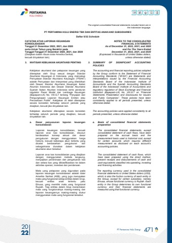 PT Pertamina Hulu Energi 471 2022The original consolidated financial statements included herein are in the Indonesian language.PT PERTAMINA HULU ENERGI TBK DAN ENTITAS ANAK/AND SUBSIDIARIES Daftar 5/32 ScheduleCATATAN ATAS LAPORAN KEUANGANKONSOLIDASIANTanggal 31 Desember 2022, 2021, dan 2020serta Untuk Tahun yang Berakhir pada Tanggal-Tanggal 31 Desember 2020, 2021, dan 2020(Disajikan dalam ribuan dolar Amerika Serikat, kecuali dinyatakan lain)NOTES TO THE CONSOLIDATEDFINANCIAL STATEMENTSAs of December 31, 2022, 2021, and 2020and For The Years Ended December 31, 2022, 2021, and 2020(Expressed in thousands of United States dollars,unless otherwise stated)3. IKHTISAR KEBIJAKAN AKUNTANSI PENTING 3. SUMMARY OF SIGNIFICANT ACCOUNTING POLICIES Kebijakan akuntansi dan pelaporan keuangan yang diterapkan oleh Grup sesuai dengan Standar Akuntansi Keuangan di Indonesia, yang mencakup Pernyataan Standar Akuntansi Keuangan (%u201cPSAK%u201d) adalah Pernyataan dan Interpretasi yang diterbitkan oleh Dewan Standar Akuntansi Keuangan Ikatan Akuntan Indonesia dan Dewan Standar Akuntansi Syariah Ikatan Akuntan Indonesia serta peraturan regulator Pasar Modal dan Lembaga Keuangan (Bapepam-LK) No. VIII.G.7 tentang %u201cPenyajian dan Pengungkapan Laporan Keuangan Emiten atau Perusahaan Publik%u201d. Kebijakan ini telah diterapkan secara konsisten terhadap seluruh periode yang disajikan, kecuali jika dinyatakan lain.The accounting and financial reporting policies adopted by the Group conform to the Statement of Financial Accounting Standards (%u201cSFAS%u201d) are Statements and Interpretations issued by the Financial Accounting Standards Board of the Indonesian Institute of Accountants and the Syariah Accounting Standards Board of the Indonesian Institute of Accountants and regulatory regulation of Stock Exchange and Financial Institution (Bapepam-LK) No. VIII.G.7 on %u201cFinancial Statements Presentation and Disclosures for Issuers and Public Companies%u201d. These policies have been consistently applied to all periods presented, unless otherwise stated.Kebijakan akuntansi diterapkan secara konsisten terhadap seluruh periode yang disajikan, kecuali dinyatakan lain.The accounting policies were applied consistently to all periods presented, unless otherwise stated.a. Dasar penyusunan laporan keuangan konsolidasiana. Basis of consolidated financial statements preparationLaporan keuangan konsolidasian, kecuali laporan arus kas konsolidasian, disusun berdasarkan konsep akrual dan dasar pengukuran dengan menggunakan harga historis, kecuali beberapa akun tertentu yang dicatat berdasarkan pengukuran lain sebagaimana diuraikan dalam kebijakan akuntansi akun tersebut.The consolidated financial statements, except consolidated statement of cash flows, have beenprepared on the accrual basis and the measurement basis used is historical cost, except for certain accounts which requires different measurement as disclosed on each account%u2019s accounting policies.Laporan arus kas konsolidasian yang disajikandengan menggunakan metode langsung, menyajikan penerimaan dan pengeluaran kas dan setara kas yang diklasifikasikan ke dalam aktivitas operasi, investasi dan pendanaan.The consolidated statement of cash flows, which have been prepared using the direct method, present receipts and disbursements of cash and cash equivalents classified into operating, investing and financing activities.Mata uang pelaporan yang digunakan pada laporan keuangan konsolidasian adalah dolar Amerika Serikat (AS$), yang juga merupakan mata uang fungsional setiap entitas dalam Grup, kecuali entitas anak tertentu yaitu Elnusa, yang memiliki mata uang fungsional Rupiah. Tiap entitas dalam Grup menentukan mata uang fungsionalnya masing-masing dan laporan keuangannya masing-masing diukur menggunakan mata uang fungsional tersebut.The reporting currency used in the consolidated financial statements is United States dollars (US$), which is also the fuction currency of each entity in the Group, except for certain subsidiary, namelyElnusa, whose functional currency is Rupiah. Each entity in the Group determines its own functional currency and their financial statements are measured using that functional currency.