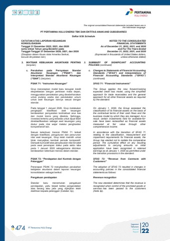 474 PT Pertamina Hulu Energi 2022Laporan TahunanAnnual ReportThe original consolidated financial statements included herein are in the Indonesian language.PT PERTAMINA HULU ENERGI TBK DAN ENTITAS ANAK/AND SUBSIDIARIES Daftar 5/35 ScheduleCATATAN ATAS LAPORAN KEUANGANKONSOLIDASIANTanggal 31 Desember 2022, 2021, dan 2020serta Untuk Tahun yang Berakhir pada Tanggal-Tanggal 31 Desember 2020, 2021, dan 2020(Disajikan dalam ribuan dolar Amerika Serikat, kecuali dinyatakan lain)NOTES TO THE CONSOLIDATEDFINANCIAL STATEMENTSAs of December 31, 2022, 2021, and 2020and For The Years Ended December 31, 2022, 2021, and 2020(Expressed in thousands of United States dollars,unless otherwise stated)3. IKHTISAR KEBIJAKAN AKUNTANSI PENTING (lanjutan)3. SUMMARY OF SIGNIFICANT ACCOUNTING POLICIES (continued)c. Perubahan pada Pernyataan Standar Akuntansi Keuangan (%u201cPSAK%u201d) dan Interpretasi Standar Akuntansi Keuangan (%u201cISAK%u201d) (lanjutan)c. Changes to Statements of Financial Accounting Standards (%u201cSFAS%u201d) and Interpretations of Financial Accounting Standards (%u201cISFAS%u201d)(continued)PSAK 71: %u201cInstrumen Keuangan%u201d SFAS 71: %u201cFinancial Instruments%u201dGrup menerapkan model baru kerugian kredit ekspektasian dengan perkiraan masa depan, menggunakan pendekatan yang disederhanakan untuk piutang usaha dan pendekatan umum untuk aset keuangan lainnya sesuai dengan standar. The Group applies the new forward-looking expected credit loss model, using the simplified approach for trade receivables and the general approach for all other financial assets as required by the standard. Pada tanggal 1 Januari 2020, Grup melakukan pengkajian klasifikasi aset keuangan berdasarkan persyaratan kontraktual arus kas dan model bisnis yang dikelola. Sehingga, investasi tertentu yang tersedia untuk dijual telah direklasifikasikan sebagai aset keuangan yang diukur pada nilai wajar melalui penghasilan komprehensif lain.On January 1, 2020, the Group assessed the classification of its financial assets on the basis of the contractual terms of their cash flows and the business model by which they are managed. As a result, certain investments held for available-forsale have been reclassified as financial assets measured at fair value through other comprehensive income.Sesuai ketentuan transisi PSAK 71 terkait dengan klasifikasi, pengukuran dan penurunan nilai aset keuangan, Grup telah memilih untuk tidak menyajikan kembali periode komparatif. Dampak kumulatif atas penyesuaian nilai tercatat pada awal penerapan diakui pada saldo laba pada 1 Januari 2020 sebagaimana diizinkan berdasarkan ketentuan transisi dalam standar.In accordance with the transition of SFAS 71 relating to the classification, measurement and impairment requirements for financial assets, the Group has elected not to restate the comparative period. The cumulative effect on any resulting adjustments to carrying amounts on initial application have been recognized in retained earnings as at January 1, 2020 as permitted under the transition provisions in the standard.PSAK 72: %u201cPendapatan dari Kontrak dengan Pelanggan%u201dSFAS 72: %u201cRevenue from Contracts with Customers%u201dPenerapan PSAK 72 menghasilkan perubahan kebijakan akuntansi dalam laporan keuangan konsolidasian sebagai berikut:The adoption of SFAS 72 resulted in changes in accounting policies in the consolidated financial statements as follows:Pengakuan pendapatan Revenue recognitionStandar baru menentukan pengakuan pendapatan, yaitu terjadi ketika pengendalian atas barang atau jasa yang dijanjikan telah dialihkan kepada pelanggan (Catatan 3p).The new standard determines that the revenue is recognized when control of the promised goods or services has been passed to the customers (Note 3p).