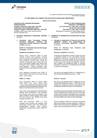 PT Pertamina Hulu Energi 475 2022The original consolidated financial statements included herein are in the Indonesian language.PT PERTAMINA HULU ENERGI TBK DAN ENTITAS ANAK/AND SUBSIDIARIES Daftar 5/36 ScheduleCATATAN ATAS LAPORAN KEUANGANKONSOLIDASIANTanggal 31 Desember 2022, 2021, dan 2020serta Untuk Tahun yang Berakhir pada Tanggal-Tanggal 31 Desember 2020, 2021, dan 2020(Disajikan dalam ribuan dolar Amerika Serikat, kecuali dinyatakan lain)NOTES TO THE CONSOLIDATEDFINANCIAL STATEMENTSAs of December 31, 2022, 2021, and 2020and For The Years Ended December 31, 2022, 2021, and 2020(Expressed in thousands of United States dollars,unless otherwise stated)3. IKHTISAR KEBIJAKAN AKUNTANSI PENTING (lanjutan)3. SUMMARY OF SIGNIFICANT ACCOUNTING POLICIES (continued)c. Perubahan pada Pernyataan Standar Akuntansi Keuangan (%u201cPSAK%u201d) dan Interpretasi Standar Akuntansi Keuangan (%u201cISAK%u201d) (lanjutan)c. Changes to Statements of Financial Accounting Standards (%u201cSFAS%u201d) and Interpretations of Financial Accounting Standards (%u201cISFAS%u201d) (continued)PSAK 72: %u201cPendapatan dari Kontrak dengan Pelanggan%u201d (lanjutan)SFAS 72: %u201cRevenue from Contracts with Customers%u201d (continued)Pengakuan pendapatan (lanjutan) Revenue recognition (continued)Secara umum, penerapan PSAK 72 tidak memiliki dampak yang signifikan terhadap laporan keuangan konsolidasian Grup, kecuali untuk perlakuan akuntansi atas overlift dan underlift. Pendapatan yang dicatat oleh Grup harus menunjukan imbalan yang diterima dari pelanggan atas pengalihan barang atau jasa yang dijanjikan kepada pelanggan, tidak termasuk jumlah yang ditagih atas nama pihak ketiga.In general, the application of SFAS 72 does not have a significant impact on the consolidated financial statement of the Group, except for the accounting treatment for overlift and underlift. Revenue recorded by the Group must indicate consideration received from customer for transferring goods or services promised to customers, not including amounts billed on behalf of third parties.Grup melakukan penerapan atas PSAK 72 secara efektif untuk tahun buku yang dimulai pada 1 Januari 2020.The Group has adopted SFAS No. 72 effectively for the financial year beginning January 1, 2020.PSAK 73: %u201cSewa%u201d SFAS 73: %u201cLeases%u201dGrup menerapkan PSAK 73 secara efektif untuk tahun buku yang dimulai pada 1 Januari 2020, tetapi tidak menyajikan kembali periode komparatif sebagaimana diizinkan oleh ketentuan transisi khusus dalam standar.The Group has adopted SFAS 73 effectively for the financial year beginning January 1, 2020, but has not restated the comparative period as permitted under the specific transition provisions in the standard.Untuk sewa yang sebelumnya diklasifikasikan sebagai sewa pembiayaan, Grup mengakui nilai tercatat aset sewa dan liabilitas sewa segera sebelum transisi sebagai nilai tercatat dari aset hak-guna dan liabilitas sewa pada tanggal penerapan awal.For leases previously classified as finance leases, the Group recognized the carrying amount of the lease asset and lease liability immediately before transition as the carrying amount of the right of use asset and the lease liability at the date of initial application.Pada saat penerapan PSAK 73, Grup mengakui aset hak-guna dan liabilitas sewa sehubungan dengan sewa yang sebelumnya diklasifikasikan sebagai %u2018sewa operasi%u2019 berdasarkan prinsip-prinsip dalam PSAK 30, %u201cSewa%u201d.Upon the adoption of SFAS 73, the Group recognizedright-of-use assets and lease liabilities in relation to leases which were previously classified as %u2018operating lease%u2019 under the principles of SFAS 30, %u201cLeases%u201d.