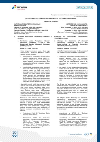 PT Pertamina Hulu Energi 477 2022The original consolidated financial statements included herein are in the Indonesian language.PT PERTAMINA HULU ENERGI TBK DAN ENTITAS ANAK/AND SUBSIDIARIES Daftar 5/38 ScheduleCATATAN ATAS LAPORAN KEUANGANKONSOLIDASIANTanggal 31 Desember 2022, 2021, dan 2020serta Untuk Tahun yang Berakhir pada Tanggal-Tanggal 31 Desember 2020, 2021, dan 2020(Disajikan dalam ribuan dolar Amerika Serikat, kecuali dinyatakan lain)NOTES TO THE CONSOLIDATEDFINANCIAL STATEMENTSAs of December 31, 2022, 2021, and 2020and For The Years Ended December 31, 2022, 2021, and 2020(Expressed in thousands of United States dollars,unless otherwise stated)3. IKHTISAR KEBIJAKAN AKUNTANSI PENTING (lanjutan)3. SUMMARY OF SIGNIFICANT ACCOUNTING POLICIES (continued)c. Perubahan pada Pernyataan Standar Akuntansi Keuangan (%u201cPSAK%u201d) dan Interpretasi Standar Akuntansi Keuangan (%u201cISAK%u201d) (lanjutan)c. Changes to Statements of Financial Accounting Standards (%u201cSFAS%u201d) and Interpretations of Financial Accounting Standards (%u201cISFAS%u201d) (continued)PSAK 73: %u201cSewa%u201d (lanjutan) SFAS 73: %u201cLeases%u201d (continued)Pada tanggal penerapan awal, Grup juga menggunakan beberapa kebijakan praktis sebagai berikut: (lanjutan)At the first implementation date, the Group elected the following practical expedients: (continued)- mengandalkan penilaiannya apakah sewa bersifat memberatkan sesuai PSAK 57: Provisi, Kontingen, dan Aset Kontingen segera sebelum tanggal penerapan awal sebagai alternatif untuk melakukan tinjauan penurunan nilai;- relied on its assessment of whether leases are onerous applying SFAS 57: Provision, Contingent, and Contingent Asset immediately before the first implementation date as an alternative to performing an impairment analysis;- memilih tidak menerapkan model akuntansi sewa baru untuk sewa yang masa sewanya berakhir dalam 12 bulan dari tanggal penerapan awal. Mencatat sewa tersebut dengan cara yang sama dengan sewa jangka pendek dan memasukkan biaya yang terkait dengan sewa tersebut dalam pengungkapan beban sewa jangka-pendek dalam periode pelaporan tahunan yang mencakup tanggal penerapan awal.- not to apply the new lease accounting model to leases for which the lease term ends within 12 months after the date of initial application. It has accounted for those leases as short-term leases and accounted those expenses in regard to the leases in the short-term lease disclosure in the financial reporting which covers the period of the first implementation dateGrup telah memilih untuk tidak menilai kembali apakah suatu kontrak mengandung sewa atau tidak pada tanggal penerapan awal untuk kontrak yang telah ada sebelum tanggal transisi yang dimana Grup telah menggunakan penilaian yang dibuat sesuai dengan PSAK 30, %u201cSewa%u201d dan ISAK 8, %u201cPenentuan Apakah Suatu Perjanjian Mengandung Suatu Sewa%u201d.The Group has also elected not to reassess whether a contract contains a lease or not at the date of initial application for the contracts entered into before the transition date that the Group has made assessment under SFAS 30, %u201cLeases%u201d and ISFAS 8, %u201cDetermining whether an Arrangement contains a Lease%u201d.Penerapan dari standar baru, interpretasi, amandemen dan penyesuaian tahunan terhadap standar akuntansi, yang berlaku efektif sejak tanggal 1 Januari 2021 tidak menyebabkan perubahan signifikan atas kebijakan akuntansi Grup dan tidak memberikan dampak yang material terhadap jumlah yang dilaporkan di laporan keuangan konsolidasian pada tahun berjalan:The adoption of the following new standards, interpretations, amendments and annual improvements to accounting standards which are effective from January 1, 2021 did not result in substantial changes to the Group%u2019s accounting policies and had no material effect on the amountsreported in the consolidated financial statements for the current year: - Amandemen PSAK 22 %u201cKombinasi Bisnis tentang Definisi Bisnis%u201c;- Amendment to SFAS 22 %u201cBusiness Combination on Business Definition%u201c;- Amandemen PSAK 55 \Keuangan - Pengakuan dan Pengukuran%u201c, PSAK 60 %u201cInstrumen Keuangan - Pengungkapan%u201c, PSAK 62 %u201cKontrak Asuransi%u201d, PSAK 71 %u201cInstrumen Keuangan%u201c dan PSAK 73 %u201cSewa%u201c, tentang Reformasi Acuan Suku Bunga Tahap 2;- Amendment to SFAS 55 %u201cFinancial Instruments - Recognition and Measurement%u201d, SFAS 60 %u201cFinancial Instruments - Disclosure%u201c, SFAS 62 %u201cInsurance Contracts%u201d, SFAS 71 %u201cFinancial Instruments%u201c and SFAS 73 %u201cLeases%u201c, on Interest Rate Reference Reform Phase 2;
