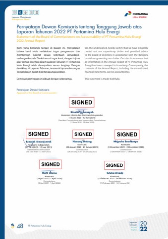Laporan Manajemen Man%u25a1Aement R<>port .. _II PERTAMINA HULU ENERGI Pernyataan Dewan Komisaris tentang Tanggung Jawab atas Laporan Tahunan 2022 PT Pertamina Hulu Energi Statement of the Board of Commissioners on Accountability of PT Pertamina Hulu Energi 2022 Annual Report Kami yang bertanda tangan di bawah ini, menyatakan bahwa kami telah melakukan tugas pengawasan dan memberikan nasihat sesuai ketentuan perundangundangan kepada Direksi sesuai tugas kami, dengan tujuan agar semua informasi dalam Laporan Tahunan PT Pertamina Hulu Energi telah disampaikan secara lengkap. Dengan demikian, isi Laporan Tahunan, termasuk laporan keuangan konsolidasian dapat dipertanggungjawabkan. Demikian pernyataan ini dibuat dengan sebenarnya. Persetujuan Dewan Komisaris A.pproval of the Board of Commissioners We, the undersigned, hereby certify that we have diligently carried out our supervisory duties and provided advice to the Board of Directors in accordance with the statutory provisions governing our duties. Our aim is to ensure that all information in the Annual Report of PT Pertamina Hulu Energi has been conveyed in its entirety. Consequently, the contents of the Annual Report, including the consolidated financial statements, can be accounted for. This statement is made truthfully. Rinald%ufffdansyah ,, 48Independent Commissioner (13 June 2020 - 12 June 2023) Mufti Jtomo Komisaris Komisaris Utama dan Komisaris lndependen (13 Juni 2020-12 Juni 2023) President Commissioner and Independent Commissioner (13 June 2020 - 12 June 2023) ,.-:: Nanang Untung Komisaris (28 Januari 2020 -27 Januari 2023) Commissioner (28 January 2020 - 27 January 2023) %ufffdroho BranYantyo Komisaris (3 Desember 2021 -2 Desember 2024) Commissioner (3 December 2021 - 2 December 2024) Tutuka Ariadji Komisaris (2 April 2021 -1 April 2024) Commissioner (15 Februari 2021 -14 Februari 2024) Commissioner (2 April 2021 - 1 April 2024) PT Pertamina Hulu Energi (15 February 2021 - 14 February 202 Laporan Tahunan Annual Report 20 22