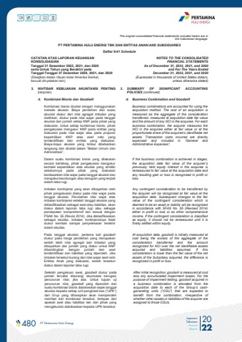 480 PT Pertamina Hulu Energi 2022Laporan TahunanAnnual ReportThe original consolidated financial statements included herein are in the Indonesian language.PT PERTAMINA HULU ENERGI TBK DAN ENTITAS ANAK/AND SUBSIDIARIES Daftar 5/41 ScheduleCATATAN ATAS LAPORAN KEUANGANKONSOLIDASIANTanggal 31 Desember 2022, 2021, dan 2020serta Untuk Tahun yang Berakhir pada Tanggal-Tanggal 31 Desember 2020, 2021, dan 2020(Disajikan dalam ribuan dolar Amerika Serikat, kecuali dinyatakan lain)NOTES TO THE CONSOLIDATEDFINANCIAL STATEMENTSAs of December 31, 2022, 2021, and 2020and For The Years Ended December 31, 2022, 2021, and 2020(Expressed in thousands of United States dollars,unless otherwise stated)3. IKHTISAR KEBIJAKAN AKUNTANSI PENTING (lanjutan)3. SUMMARY OF SIGNIFICANT ACCOUNTING POLICIES (continued)d. Kombinasi Bisnis dan Goodwill d. Business Combination and GoodwillKombinasi bisnis dicatat dengan menggunakan metode akuisisi. Biaya perolehan dari suatu akuisisi diukur dari nilai agregat imbalan yang dialihkan, diukur pada nilai wajar pada tanggal akuisisi dan jumlah setiap KNP pada pihak yang diakuisisi. Untuk setiap kombinasi bisnis, pihak pengakuisisi mengukur KNP pada entitas yang diakuisisi pada nilai wajar atau pada proporsi kepemilikan KNP atas aset neto yang teridentifikasi dari entitas yang diakuisisi. Biaya-biaya akuisisi yang timbul dibebankan langsung dan dicatat dalam %u201cBeban Umum dan Administrasi%u201d.Business combinations are accounted for using the acquisition method. The cost of an acquisition is measured as the aggregate of the consideration transferred, measured at acquisition date fair value and the amount of any NCI in the acquiree. For each business combination, the acquirer measures the NCI in the acquiree either at fair value or at the proportionate share of the acquiree%u2019s identifiable net assets. Transaction costs incurred are directly expensed and included in %u201cGeneral and Administrative Expenses%u201d.Dalam suatu kombinasi bisnis yang dilakukan secara bertahap, pihak pengakuisisi mengukur kembali kepemilikan atas ekuitas yang dimiliki sebelumnya pada pihak yang diakuisisi berdasarkan nilai wajar pada tanggal akuisisi dan mengakui keuntungan atau kerugian yang terjadi dalam laba rugi.If the business combination is achieved in stages, the acquisition date fair value of the acquirer%u2019s previously held equity interest in the acquiree is remeasured to fair value at the acquisition date and any resulting gain or loss is recognized in profit or loss.Imbalan kontinjensi yang akan dibayarkan oleh pihak pengakuisisi diakui pada nilai wajar pada tanggal akuisisi. Perubahan nilai wajar atas imbalan kontinjensi setelah tanggal akuisisi yang diklasifikasikan sebagai aset atau liabilitas, akan diakui dalam laporan laba rugi atau sebagai pendapatan komprehensif lain sesuai dengan PSAK No. 55 (Revisi 2014). Jika diklasifikasikan sebagai ekuitas, imbalan kontinjensinya tidak diukur kembali sampai penyelesaian terakhir dalam ekuitas.Any contingent consideration to be transferred by the acquirer will be recognized at fair value at the acquisition date. Subsequent changes to the fair value of the contingent consideration which is deemed to be an asset or liability will be recognized in accordance with SFAS No. 55 (Revised 2014) either in profit or loss or as other comprehensive income. If the contingent consideration is classified as equity, it should not be remeasured until it is finally settled within equity.Pada tanggal akuisisi, pertama kali goodwill diukur pada harga perolehan yang merupakan selisih lebih nilai agregat dari imbalan yang dibayarkan dan jumlah yang diakui untuk KNP dibandingkan dengan jumlah dari aset teridentifikasi dan liabilitas yang diperoleh. Jika imbalan tersebut kurang dari nilai wajar aset neto Entitas Anak yang diakuisisi, selisih tersebut diakui dalam laporan laba rugi.At acquisition date, goodwill is initially measured at cost being the excess of the aggregate of the consideration transferred and the amount recognized for NCI over the net identifiable assets acquired and liabilities assumed. If this consideration is lower than the fair value of the net assets of the Subsidiary acquired, the difference is recognized in profit or loss.Setelah pengakuan awal, goodwill diukur pada jumlah tercatat dikurangi akumulasi kerugian penurunan nilai, jika ada. Untuk tujuan uji penurunan nilai, goodwill yang diperoleh dari suatu kombinasi bisnis dialokasikan sejak tanggal akuisisi kepada setiap unit penghasil kas (%u201cUPK%u201d) dari Grup yang diharapkan akan memperoleh manfaat dari kombinasi tersebut, terlepas dari apakah aset atau liabilitas lain dari pihak yang mengakuisisi dialokasikan kepada UPK tersebut.After initial recognition, goodwill is measured at cost less any accumulated impairment losses. For the purpose of impairment testing, goodwill acquired in a business combination is allocated from the acquisition date to each of the Group%u2019s cashgenerating units (%u201cCGU%u201d) that are expected to benefit from the combination, irrespective of whether other assets or liabilities of the acquirer are assigned to those CGUs.