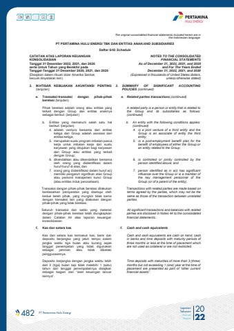482 PT Pertamina Hulu Energi 2022Laporan TahunanAnnual ReportThe original consolidated financial statements included herein are in the Indonesian language.PT PERTAMINA HULU ENERGI TBK DAN ENTITAS ANAK/AND SUBSIDIARIES Daftar 5/43 ScheduleCATATAN ATAS LAPORAN KEUANGANKONSOLIDASIANTanggal 31 Desember 2022, 2021, dan 2020serta Untuk Tahun yang Berakhir pada Tanggal-Tanggal 31 Desember 2020, 2021, dan 2020(Disajikan dalam ribuan dolar Amerika Serikat, kecuali dinyatakan lain)NOTES TO THE CONSOLIDATEDFINANCIAL STATEMENTSAs of December 31, 2022, 2021, and 2020and For The Years Ended December 31, 2022, 2021, and 2020(Expressed in thousands of United States dollars,unless otherwise stated)3. IKHTISAR KEBIJAKAN AKUNTANSI PENTING (lanjutan)3. SUMMARY OF SIGNIFICANT ACCOUNTING POLICIES (continued)e. Transaksi-transaksi dengan pihak-pihak berelasi (lanjutan)e. Related parties transactions (continued)Pihak berelasi adalah orang atau entitas yang terkait dengan Group dan entitas anaknya sebagai berikut: (lanjutan)A related party is a person or entity that is related to the Group and its subsidiaries as follows:(continued)b. Entitas yang memenuhi salah satu hal berikut: (lanjutan)b. An entity with the following conditions applies: (continued)4. adalah ventura bersama dari entitas ketiga dan Group adalah asosiasi dari entitas ketiga;4. is a joint venture of a third entity and the Group is an associate of entity the third entity;5. merupakan suatu program imbalan pasca kerja untuk imbalan kerja dari suatu karyawan yang ditujukan bagi karyawan dari Group atau entitas yang terkait dengan Group;5. is a post-employment benefit plan for the benefit of employees of either the Group or an entity related to the Group; 6. dikendalikan atau dikendalikan bersama oleh orang yang diidentifikasi dalam huruf-huruf di atas; dan6. is controlled or jointly controlled by the person identified above; and7. orang yang diidentifikasi dalam huruf a(i) memiliki pengaruh signifikan atas Groupatau personil manajemen kunci Group(atau entitas induk perusahaan).7. person identified as in a(i) has significant influence over the Group or is a member of the key management personnel of the Group (or of a parent of the entity).Transaksi dengan pihak-pihak berelasi dilakukan berdasarkan persyaratan yang disetujui oleh kedua belah pihak, yang mungkin tidak sama dengan transaksi lain yang dilakukan dengan pihak-pihak yang tidak berelasi.Transactions with related parties are made based on terms agreed by the parties, which may not be the same as those of the transaction between unrelated parties. Seluruh transaksi dan saldo yang material dengan pihak-pihak berelasi telah diungkapkan dalam Catatan 44 atas laporan keuangan konsolidasian.All significant transactions and balances with related parties are disclosed in Notes 44 to the consolidated financial statements. f. Kas dan setara kas f. Cash and cash equivalentsKas dan setara kas termasuk kas, bank dan deposito berjangka yang jatuh tempo dalam jangka waktu tiga bulan atau kurang sejak tanggal penempatan yang tidak digunakan sebagai jaminan atau tidak dibatasi penggunaannya. Cash and cash equivalents are cash on hand, cash in banks and time deposits with maturity periods of three months or less at the time of placement which are not used as collateral or are not restricted. Deposito berjangka dengan jangka waktu lebih dari 3 (tiga) bulan tapi tidak melebihi 1 (satu) tahun dari tanggal penempatannya disajikan sebagai bagian dari %u201caset keuangan lancar lainnya%u201d.Time deposits with maturities of more than 3 (three) months but not exceeding 1 (one) year at the time of placement are presented as part of %u201cother current financial assets%u201d.