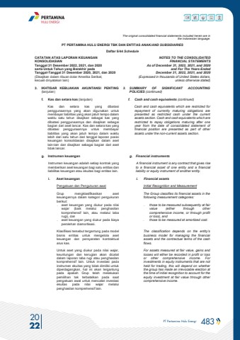 PT Pertamina Hulu Energi 483 2022The original consolidated financial statements included herein are in the Indonesian language.PT PERTAMINA HULU ENERGI TBK DAN ENTITAS ANAK/AND SUBSIDIARIES Daftar 5/44 ScheduleCATATAN ATAS LAPORAN KEUANGANKONSOLIDASIANTanggal 31 Desember 2022, 2021, dan 2020serta Untuk Tahun yang Berakhir pada Tanggal-Tanggal 31 Desember 2020, 2021, dan 2020(Disajikan dalam ribuan dolar Amerika Serikat, kecuali dinyatakan lain)NOTES TO THE CONSOLIDATEDFINANCIAL STATEMENTSAs of December 31, 2022, 2021, and 2020and For The Years Ended December 31, 2022, 2021, and 2020(Expressed in thousands of United States dollars,unless otherwise stated)3. IKHTISAR KEBIJAKAN AKUNTANSI PENTING (lanjutan)3. SUMMARY OF SIGNIFICANT ACCOUNTING POLICIES (continued)f. Kas dan setara kas (lanjutan) f. Cash and cash equivalents (continued)Kas dan setara kas yang dibatasi penggunaannya yang akan digunakan untuk membayar liabilitas yang akan jatuh tempo dalam waktu satu tahun disajikan sebagai kas yang dibatasi penggunaannya dan disajikan sebagai bagian dari aset lancar. Kas dan setara kas yang dibatasi penggunaannya untuk membayar liabilitas yang akan jatuh tempo dalam waktu lebih dari satu tahun dari tanggal laporan posisi keuangan konsolidasian disajikan dalam aset lain-lain dan disajikan sebagai bagian dari aset tidak lancar.Cash and cash equivalents which are restricted for repayment of currently maturing obligations are presented as restricted cash under the current assets section. Cash and cash equivalents which are restricted to repay obligations maturing after one year from the date of consolidated statement of financial position are presented as part of other assets under the non-current assets section.g. Instrumen keuangan g. Financial instrumentsInstrumen keuangan adalah setiap kontrak yang memberikan aset keuangan bagi satu entitas dan liabilitas keuangan atau ekuitas bagi entitas lain.A financial instrument is any contract that gives rise to a financial asset of one entity and a financial liability or equity instrument of another entity.i. Aset keuangan i. Financial assetsPengakuan dan Pengukuran awal Initial Recognition and MeasurementGrup mengklasifikasikan aset keuangannya dalam kategori pengukuran berikut:The Group classifies its financial assets in the following measurement categories:- aset keuangan yang diukur pada nilai wajar (baik melalui penghasilan komprehensif lain, atau melalui laba rugi), dan- those to be measured subsequently at fair value (either through other comprehensive income, or through profit or loss), and- aset keuangan yang diukur pada biaya perolehan diamortisasi.- those to be measured at amortized cost.Klasifikasi tersebut tergantung pada model bisnis entitas untuk mengelola aset keuangan dan persyaratan kontraktual arus kas.The classification depends on the entity%u2019s business model for managing the financial assets and the contractual terms of the cash flows.Untuk aset yang diukur pada nilai wajar, keuntungan dan kerugian akan dicatat dalam laporan laba rugi atau penghasilan komprehensif lain. Untuk investasi pada instrumen ekuitas yang tidak dimiliki untuk diperdagangkan, hal ini akan tergantung pada apakah Grup telah melakukan pemilihan tak terbatalkan pada saat pengakuan awal untuk mencatat investasi ekuitas pada nilai wajar melalui penghasilan komprehensif lain.For assets measured at fair value, gains and losses will either be recorded in profit or loss or other comprehensive income. For investments in equity instruments that are not held for trading, this will depend on whether the group has made an irrevocable election at the time of initial recognition to account for the equity investment at fair value through other comprehensive income.